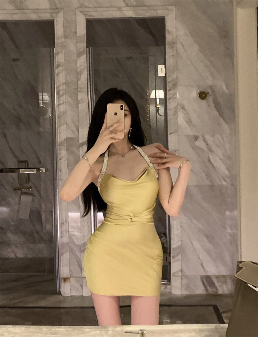 スパイスぶら下げネックドレス女性の夏フレンチ純粋な欲望風スカート黄色ウエストバックレスセクシーなバッグヒップスカートスカート サマー 夏物 ピュア bstraw75073588367 | beaute25