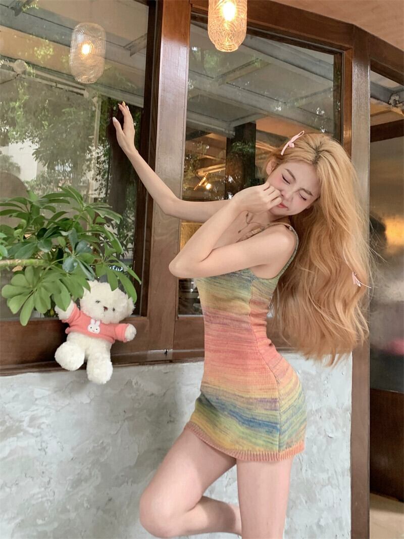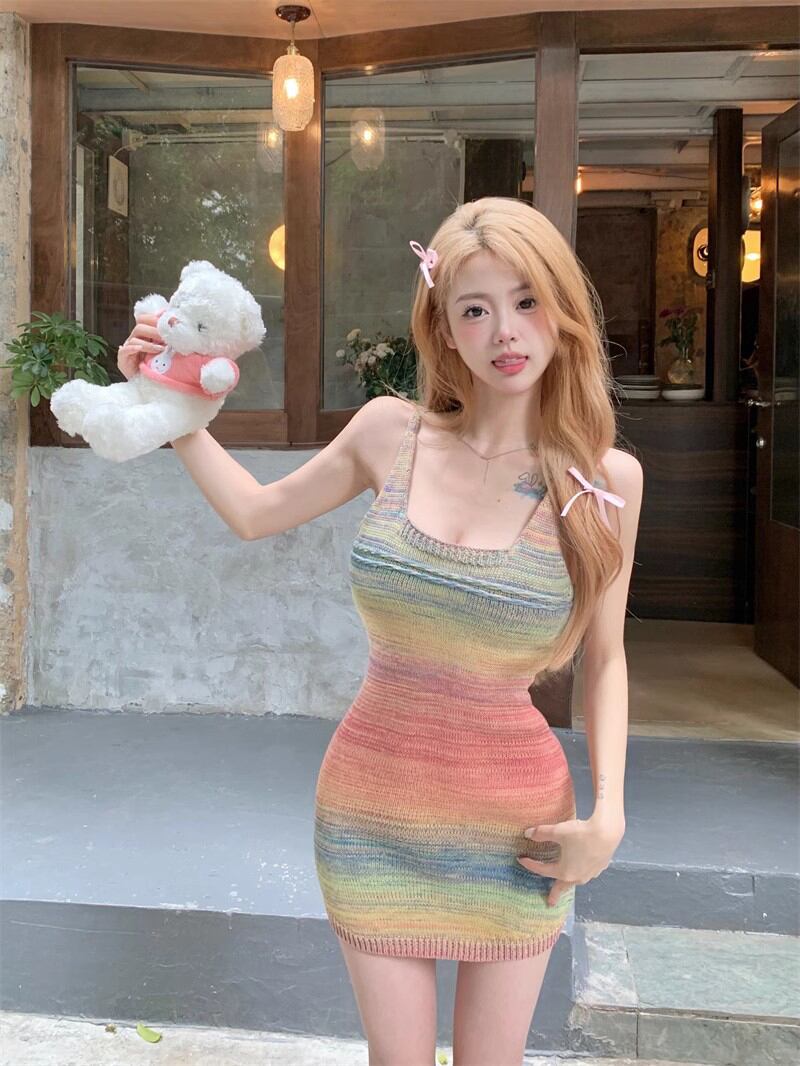 スパイスガールカラーニットスリングドレス夏セクシースクエアネックパッケージヒップスカートノースリーブタイトスリムスカート サマー 夏物 スクウェア bstraw26060247788 | beaute25