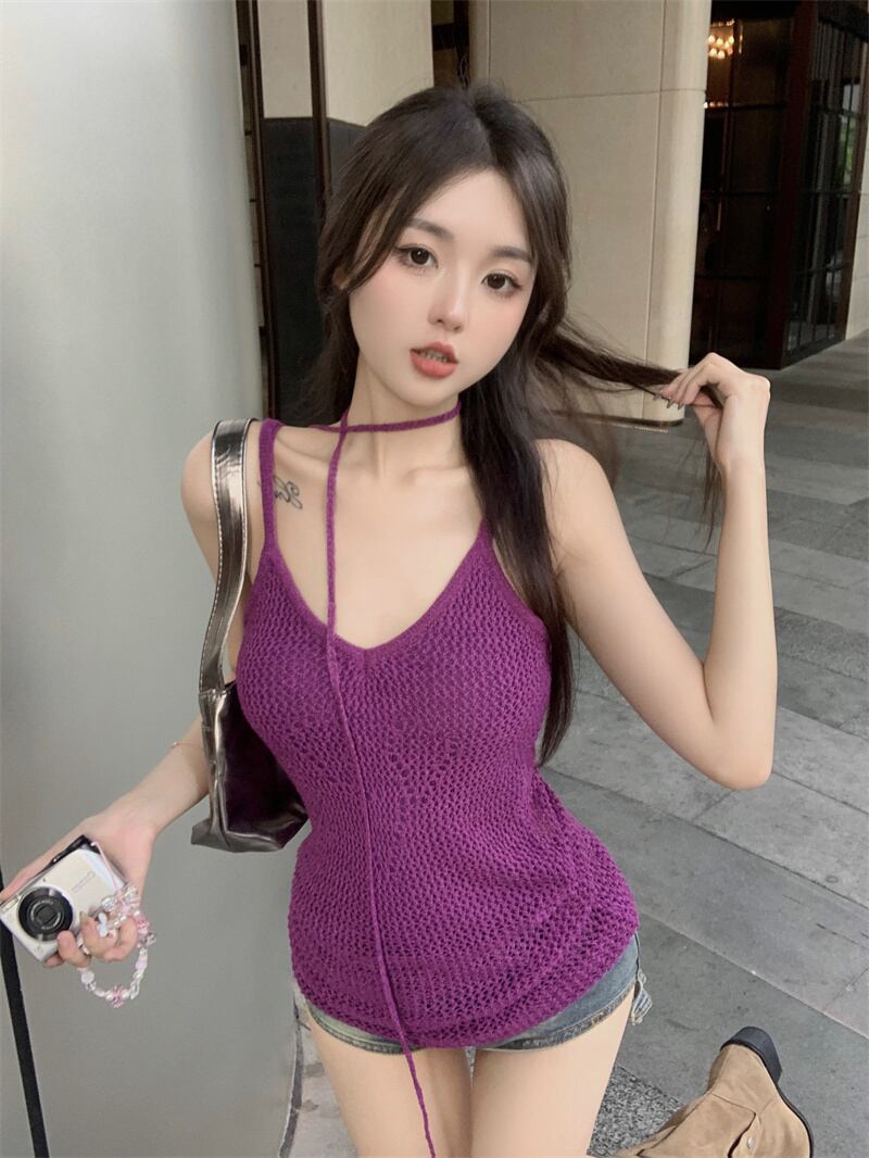 セクシーな V ネック中空ミッドレングス紫色のサスペンダー女性の夏のアウターウェアノースリーブタイバックベストホルタートップ サマー 夏物 Vネック パープル bstraw64088962385 | beaute25