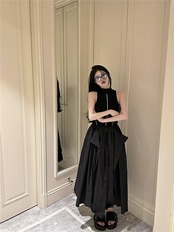 黒のハーフハイカラーニットベストドレス女性の夏のオフショルダースカートスプライシングテクスチャ高品質気質ロングスカート ブラック サマー 夏物 bstraw55042959404 | beaute25