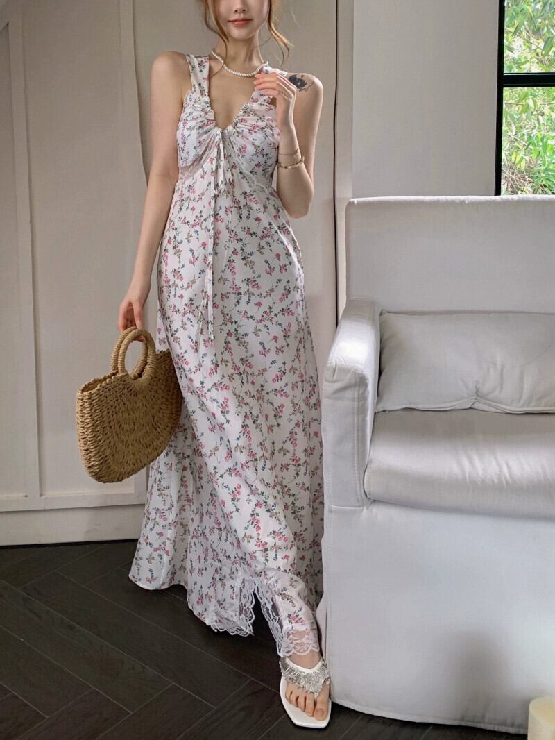 ステッチレース V ネック花柄ドレスレディースサマーストラップウエストスリットロングスカート純粋な欲望スタイル A ラインスカート 夏物 Vネック Aライン ピュア bstraw70063972160 | beaute25