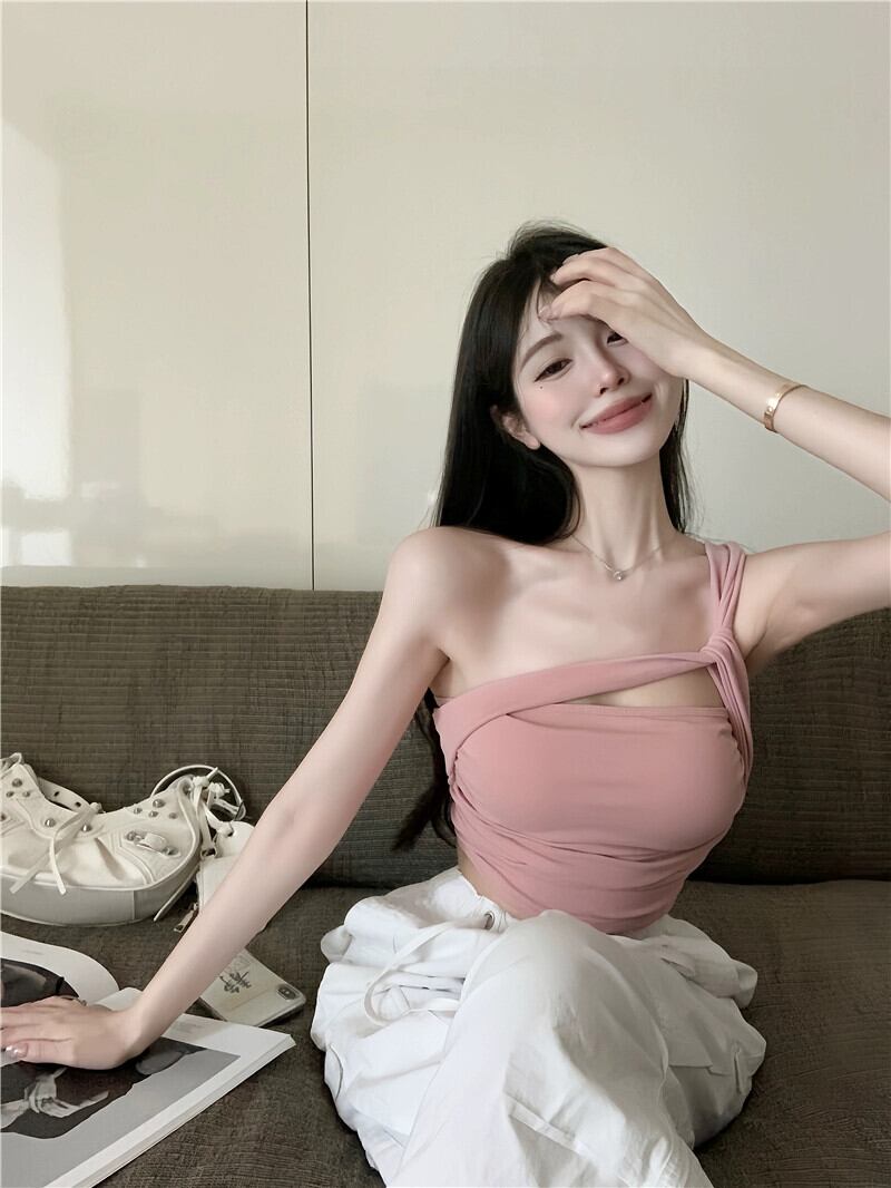 ワンショルダーのセクシーなプリーツピンクのショートベスト女性の夏の純粋な欲望スタイルのアウターウェアノースリーブホルターインナーストラップトップ サマー 夏物 ピュア bstraw41352764779 | beaute25