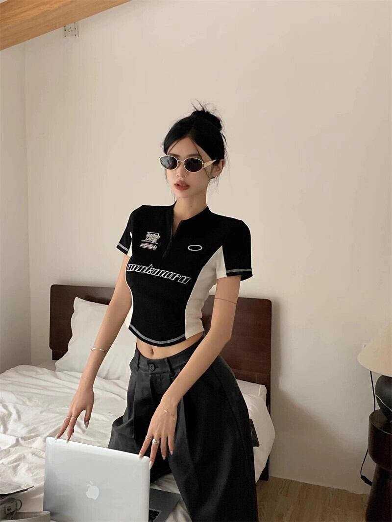 アメリカンスタイルの機能的なスタイルのスプライシングコントラストカラー刺繍トップレディースサマーデザイン甘いショートフロントショルダー半袖Tシャツ 大人ガーリー スウィート キュート カジュアル 夏物 bstraw86047038697 | beaute25