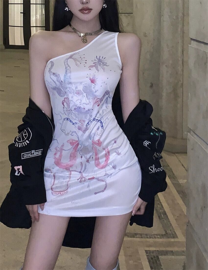 パーソナライズされたワンショルダープリントドレス女性の夏のウエストホワイトバッグヒップスカートヨーロッパとアメリカのセクシーなaラインスカート サマー 夏物 ヨーロピアン bstraw93477757574 | beaute25