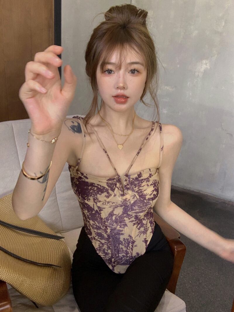 有能な弾性プリントフィッシュボーンベスト女性の夏のアウターウェア不規則な吊りネックストラップセクシーなメッシュトップ エラスティック 伸縮 サマー 夏物 bstraw27868600904 | beaute25