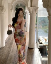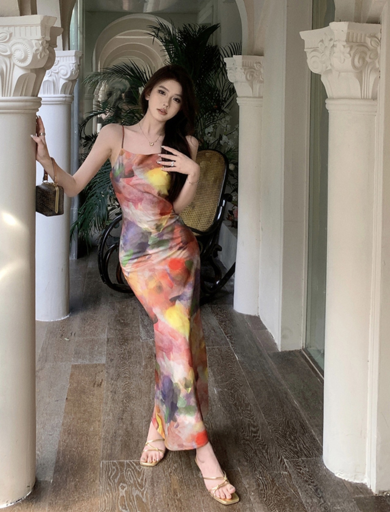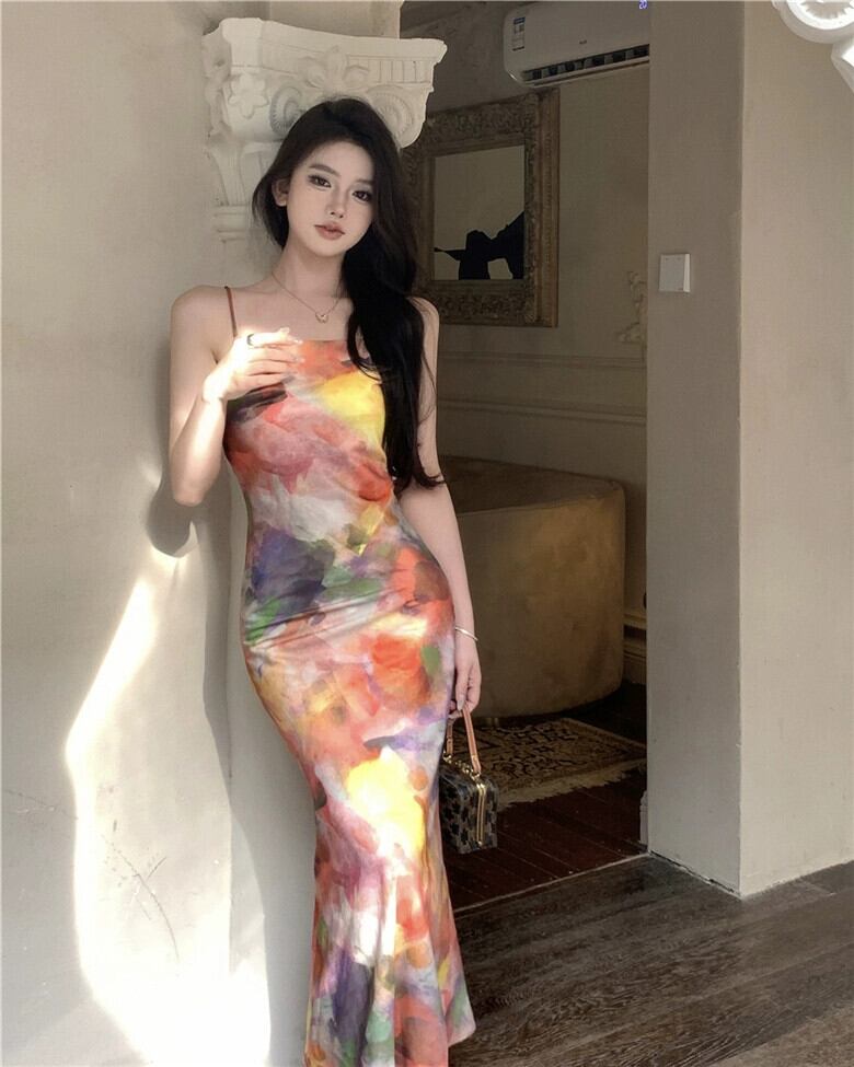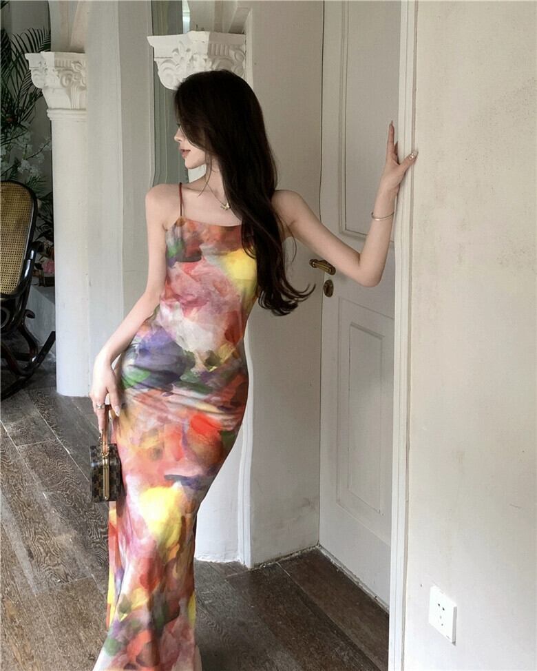 レトロセクシーなカラー油絵サスペンダードレス女性の夏のウエストレスバックパックヒップフィッシュテールロングスカート気質スカート サマー 夏物 リュック bstraw78424435881 | beaute25