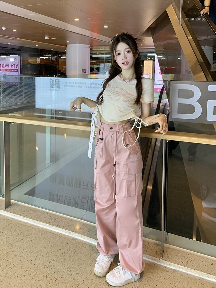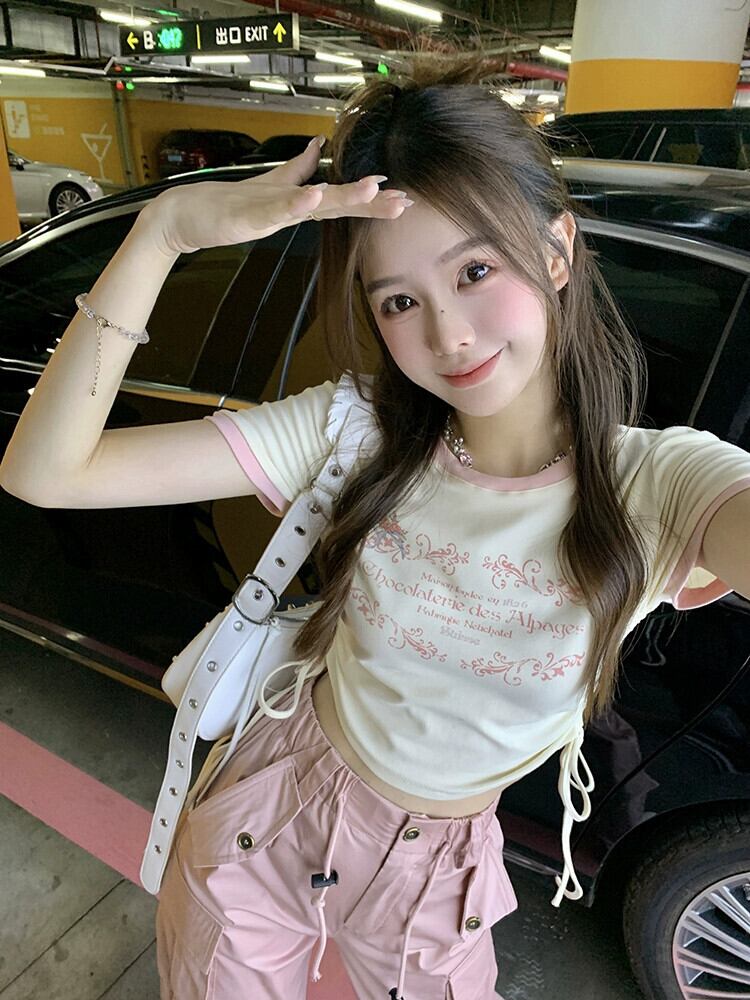 アメリカンスタイルの巾着ストラッププリントショートトップレディースサマーデザイン半袖コントラストカラーラウンドネックスリムフィットショルダーTシャツ 夏物 Oネック bstraw22731845174 | beaute25