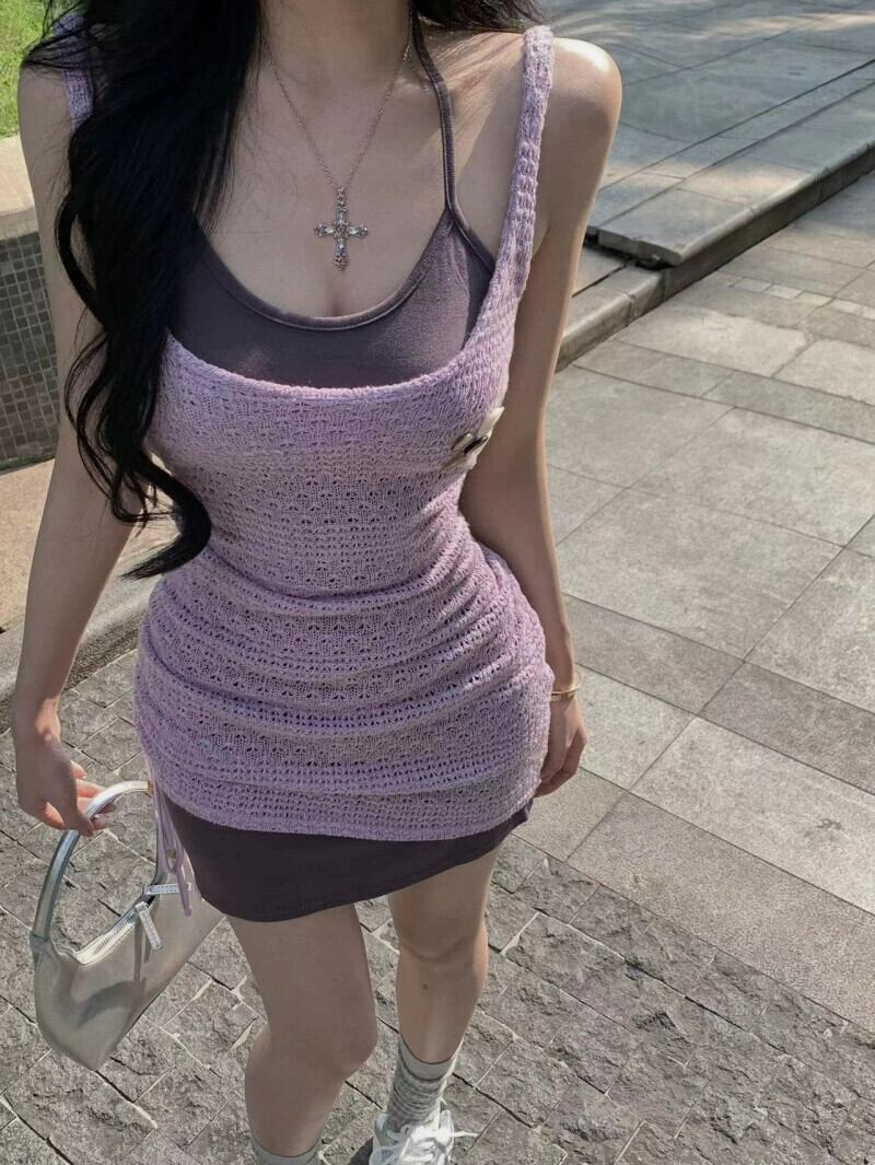 偽ツーピースサスペンダードレス女性の夏の純粋な欲望紫色の甘いスカートウエストスリムセクシーなバッグヒップスカート 大人ガーリー スウィート キュート カジュアル サマー 夏物 ピュア パープル bstraw98860349352 | beaute25