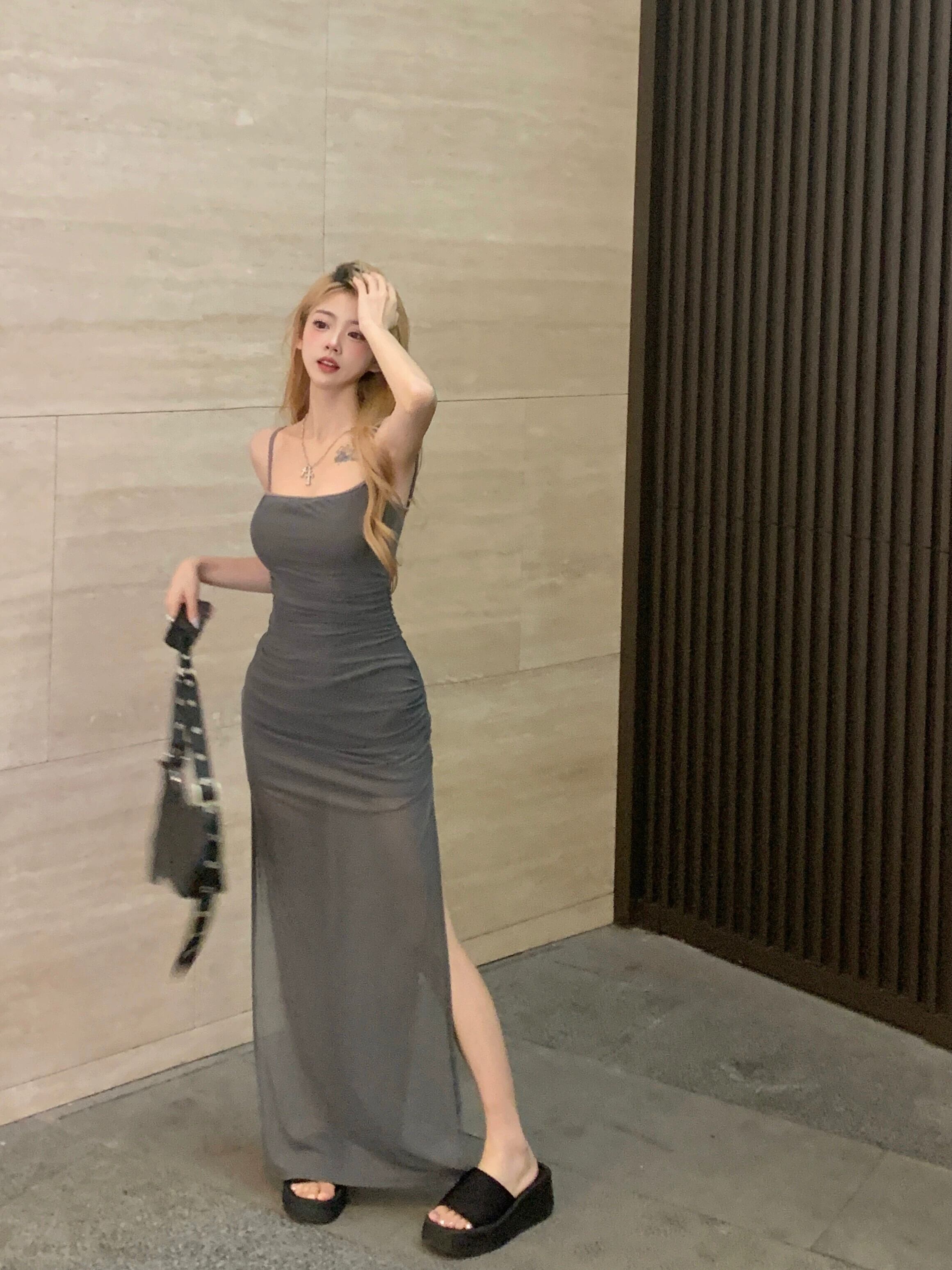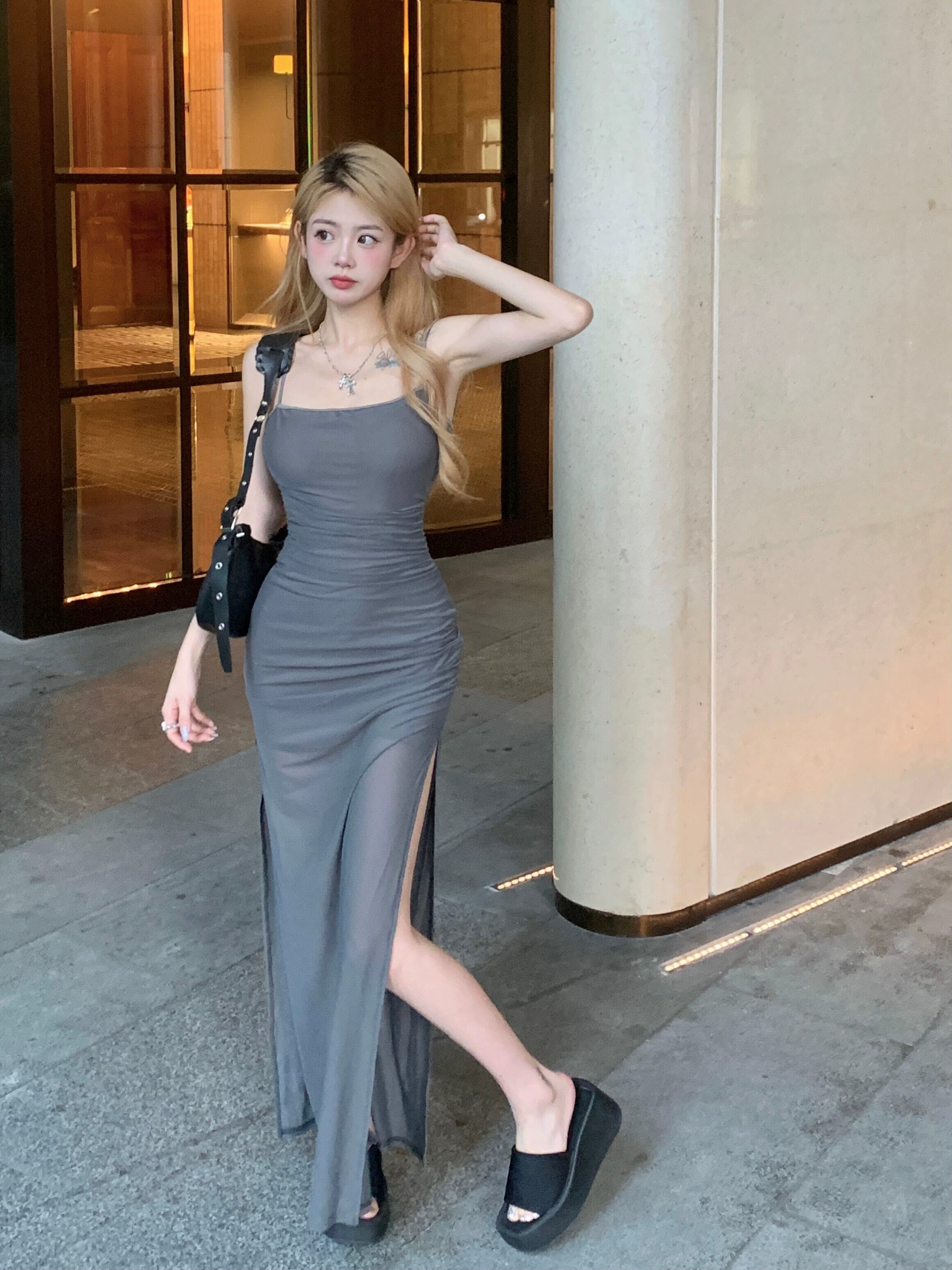 セクシーなワンショルダースリングチューブトップドレスレディース夏グレーウエストプリーツロングスカートオープンバックスリットスカート サマー 夏物 bstraw17357034922 | beaute25