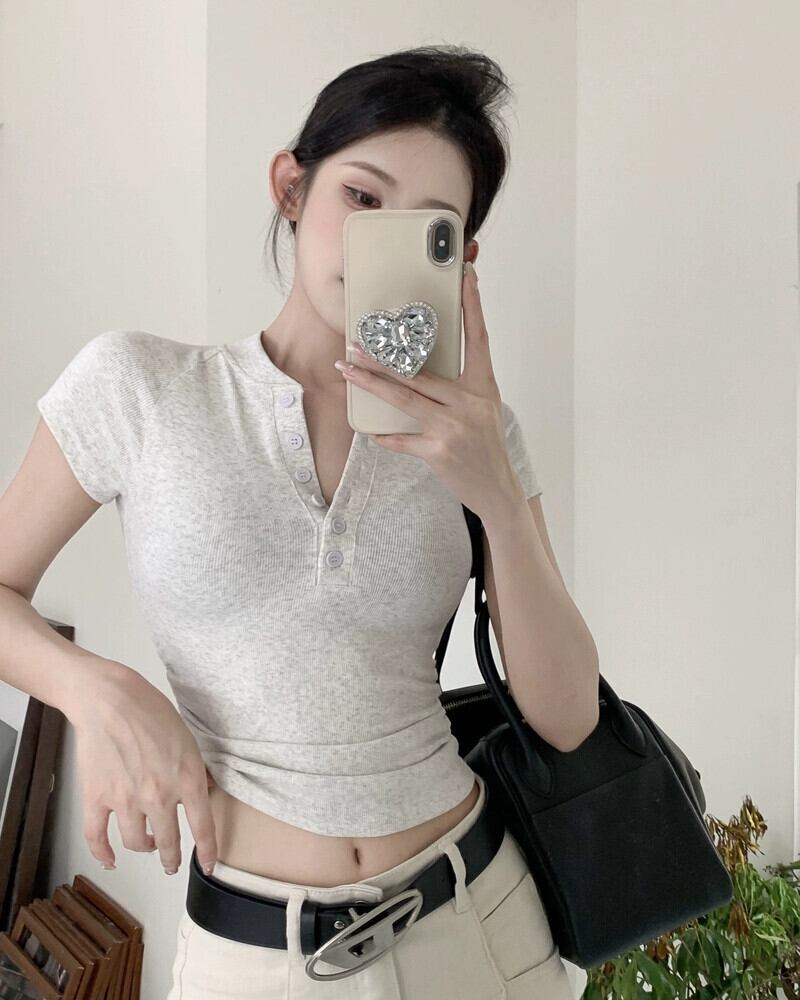 アメリカンブレストボタンアップスタンドアップカラーショートタイトトップレディースサマーデザイン純粋な欲望半袖グレースレッドTシャツ 夏物 ピュア bstraw39264459673 | beaute25