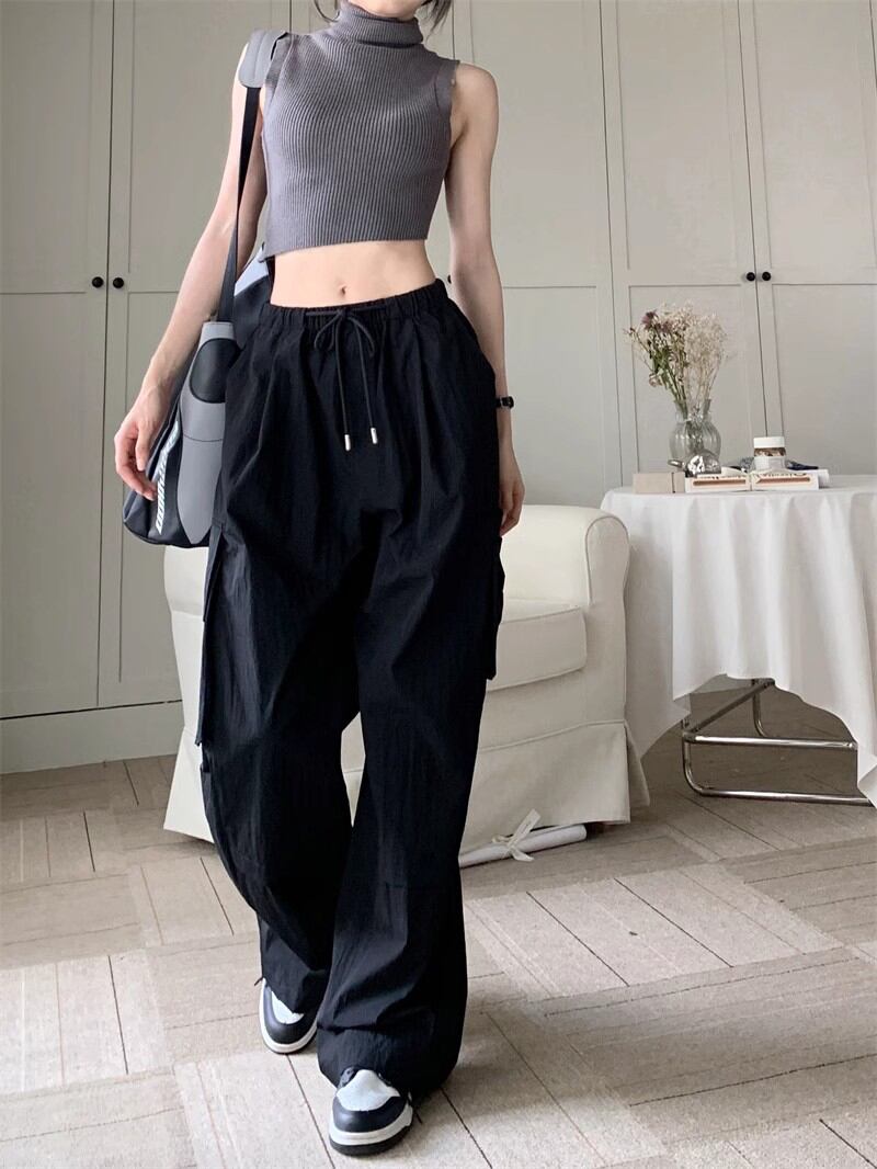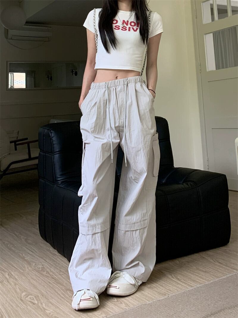 アメリカンスタイルの弾性ウエストストレートカジュアルパンツレディース夏グレー速乾性ポケット小さなツーリングワイドレッグパンツズボン エラスティック 伸縮 サマー 夏物 bstraw47991312720 | beaute25