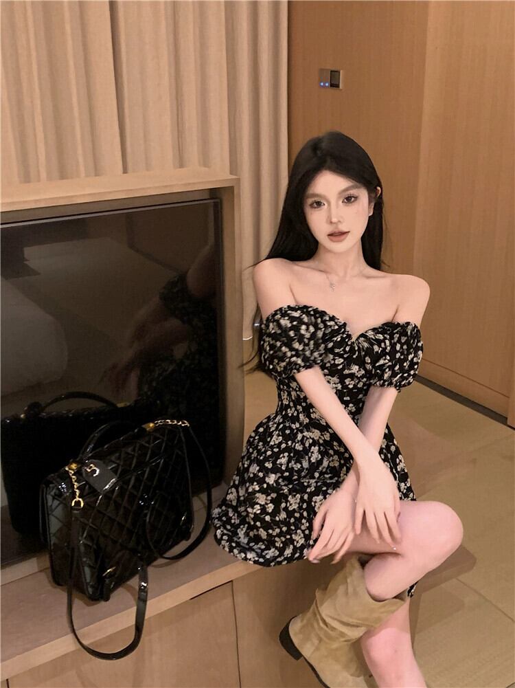 黒花柄 V ネック半袖ドレス妖精夏甘いフレンチ スカート小さなウエスト A ライン スカート ブラック 大人ガーリー スウィート キュート カジュアル サマー 夏物 Vネック Aライン bstraw26514885390 | beaute25