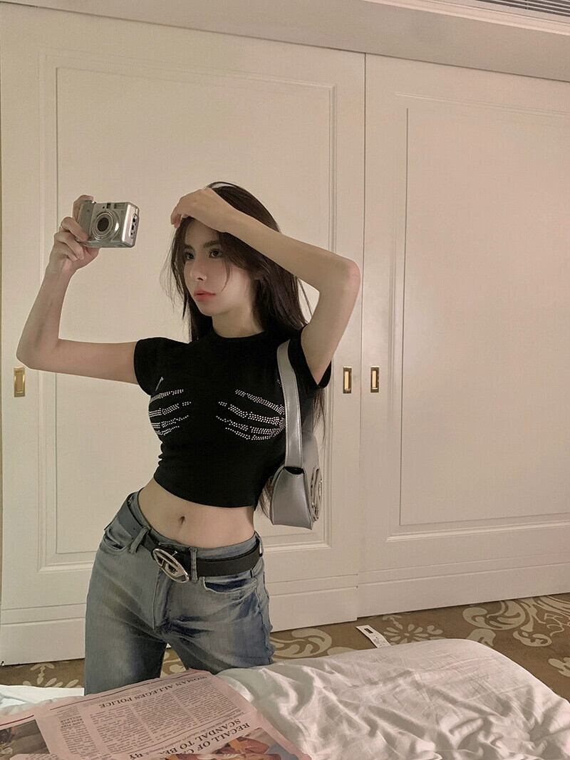 ホットブラック半袖ラウンドネッククロップトップ女性の夏の純粋な欲望スタイルヨーロッパとアメリカのオールマッチスリムショートプリントTシャツ サマー 夏物 Oネック ピュア ヨーロピアン bstraw67867006491 | beaute25