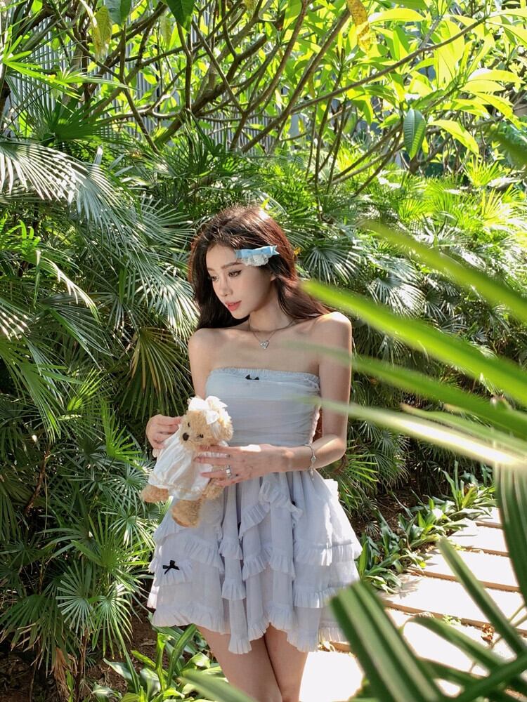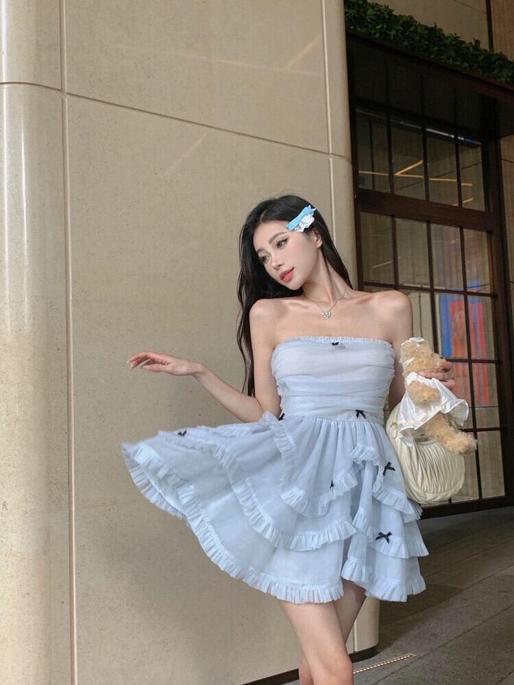 ブルーボウチューブトップドレス女性の夏のウエストふわふわショートスカート誕生日プリンセススカート純粋な欲望メッシュスカート リボン サマー 夏物 ピュア bstraw10068303676 | beaute25