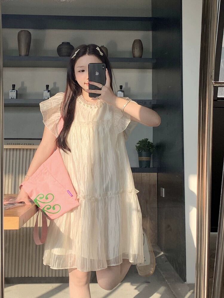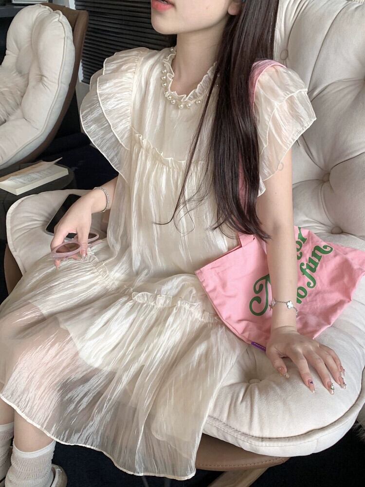 フレンチスタイルの小さなフライングスリーブドレスフェアリーサマースイートスカートパールスタンドカラー高品質気質フラウンススカート 大人ガーリー スウィート キュート カジュアル 夏物 真珠 bstraw54666047085 | beaute25