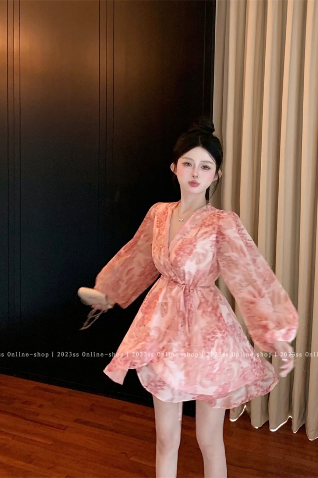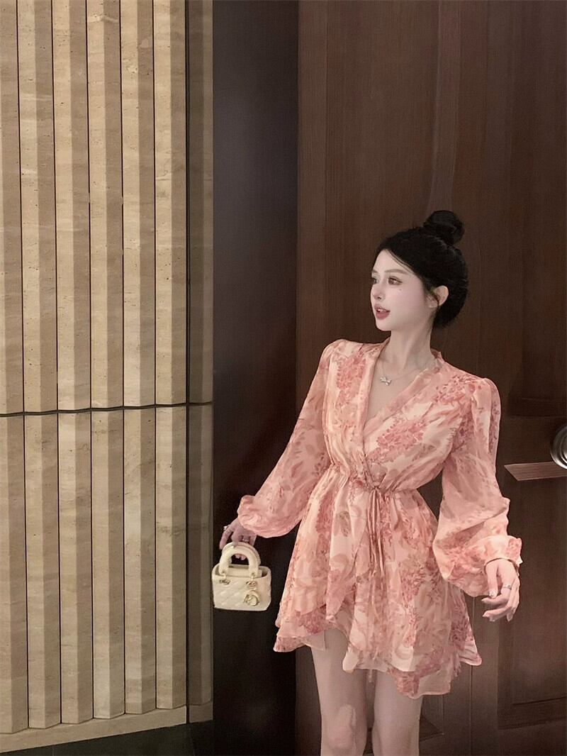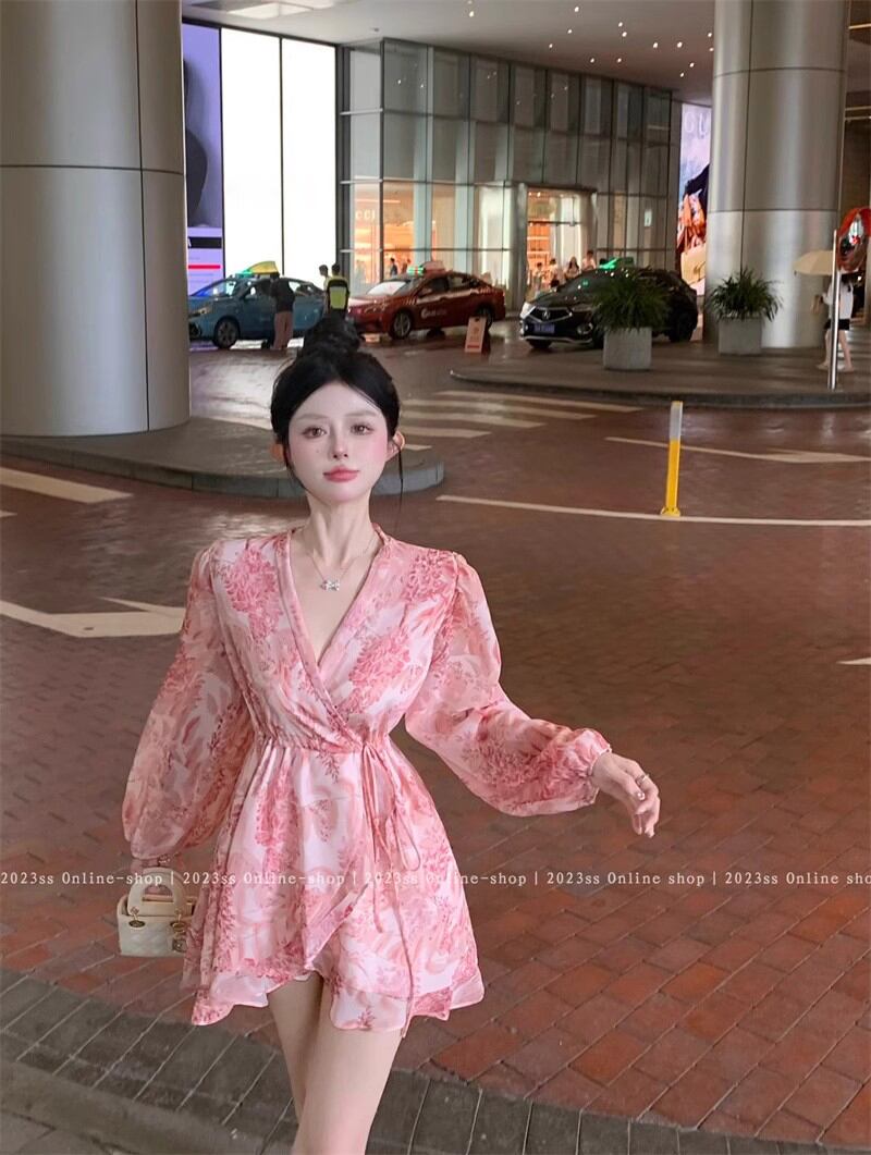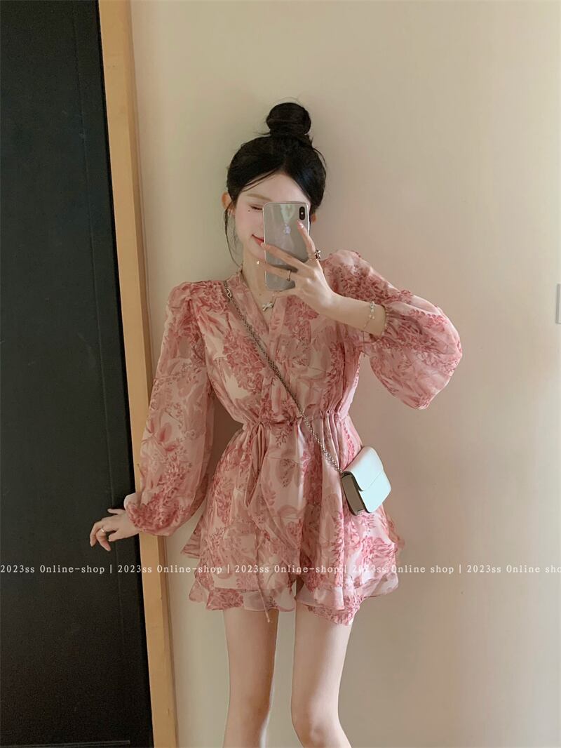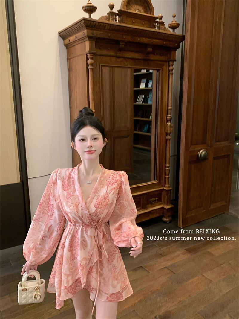 フランスの花柄長袖ドレスの女性の夏の甘い V ネックスカートちょう結び蓮の葉エッジウエスト気質ショートスカート ロング リボン 大人ガーリー スウィート キュート カジュアル サマー 夏物 Vネック bstraw72090418053 | beaute25