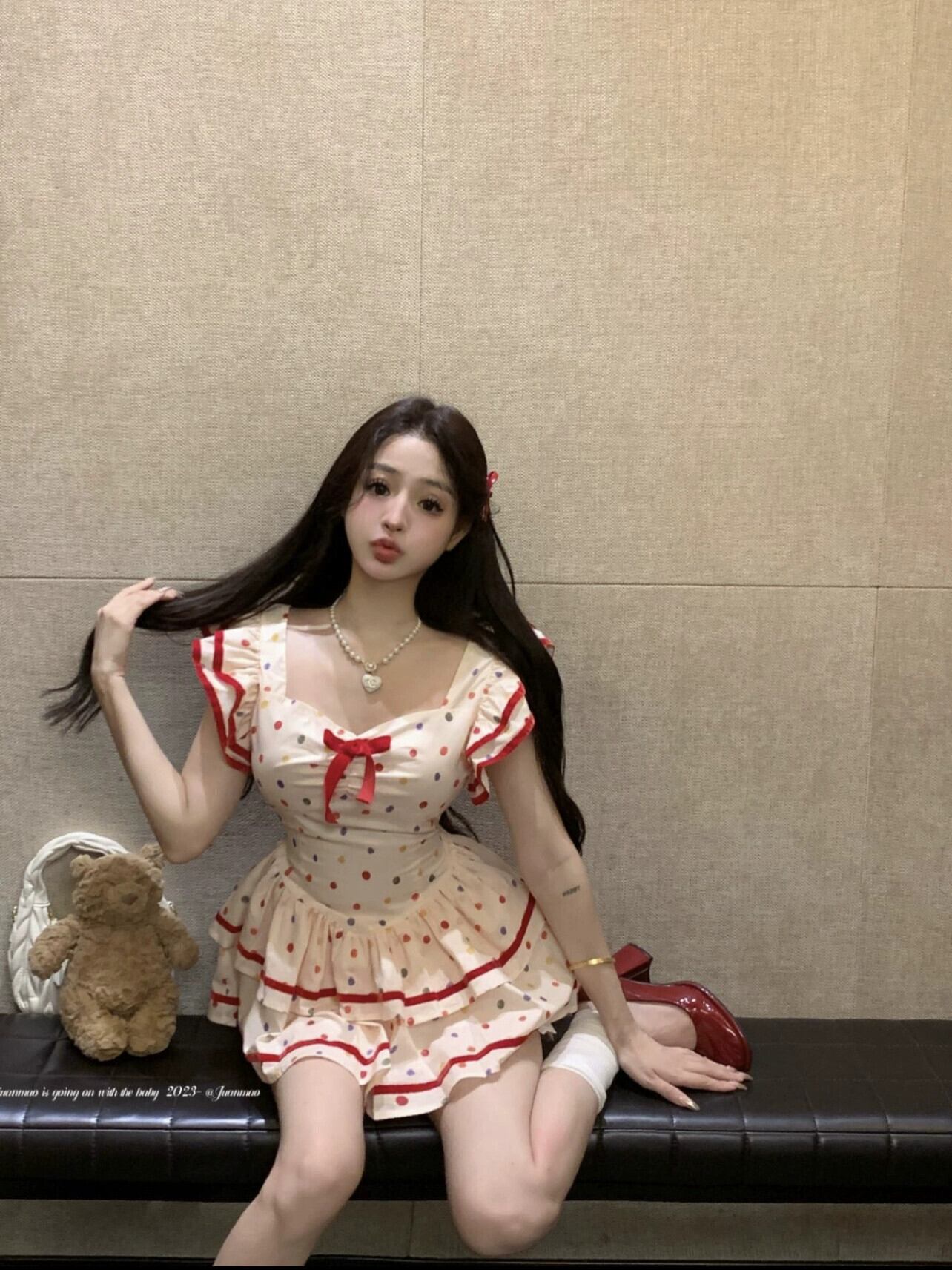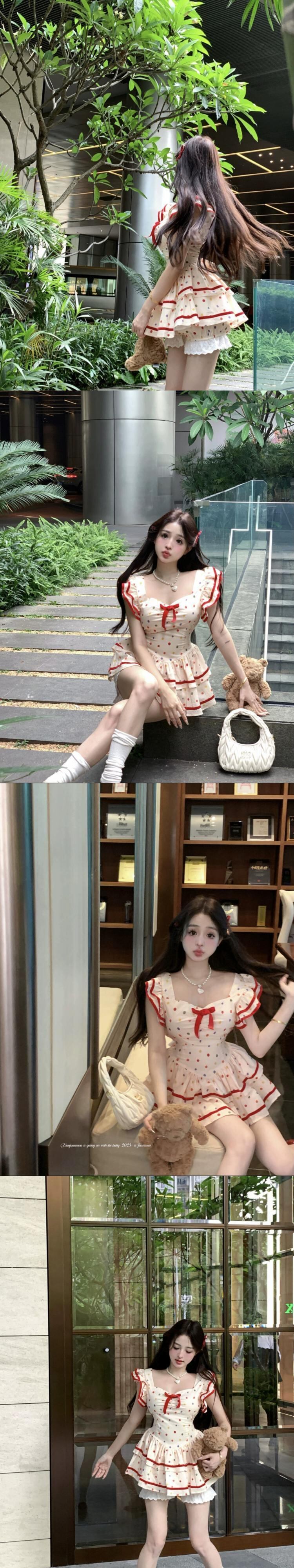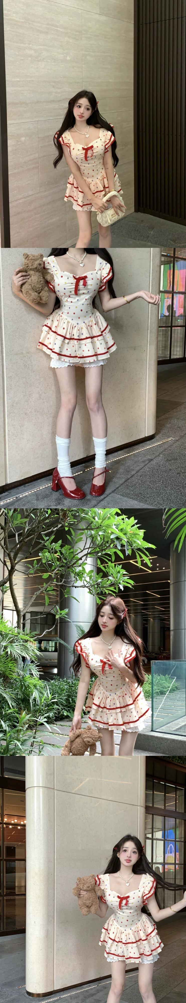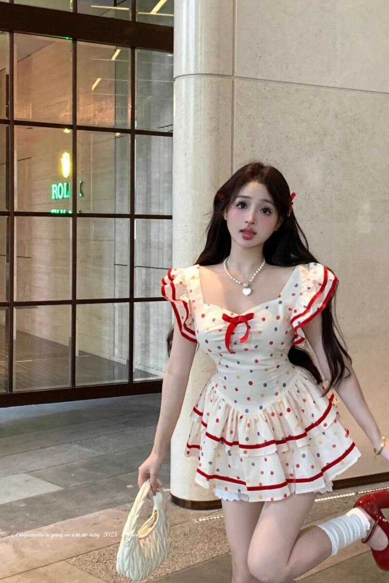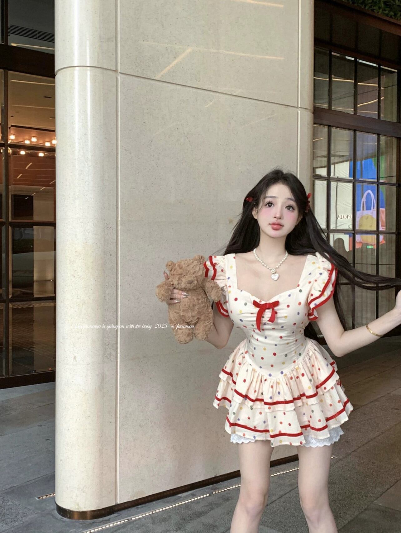 甘い小さなフライングスリーブ水玉ドレスの女性の夏のスカートボウノット水玉美しいウエストふくらんスカート リボン 大人ガーリー スウィート キュート カジュアル サマー 夏物 bstraw84433520349 | beaute25