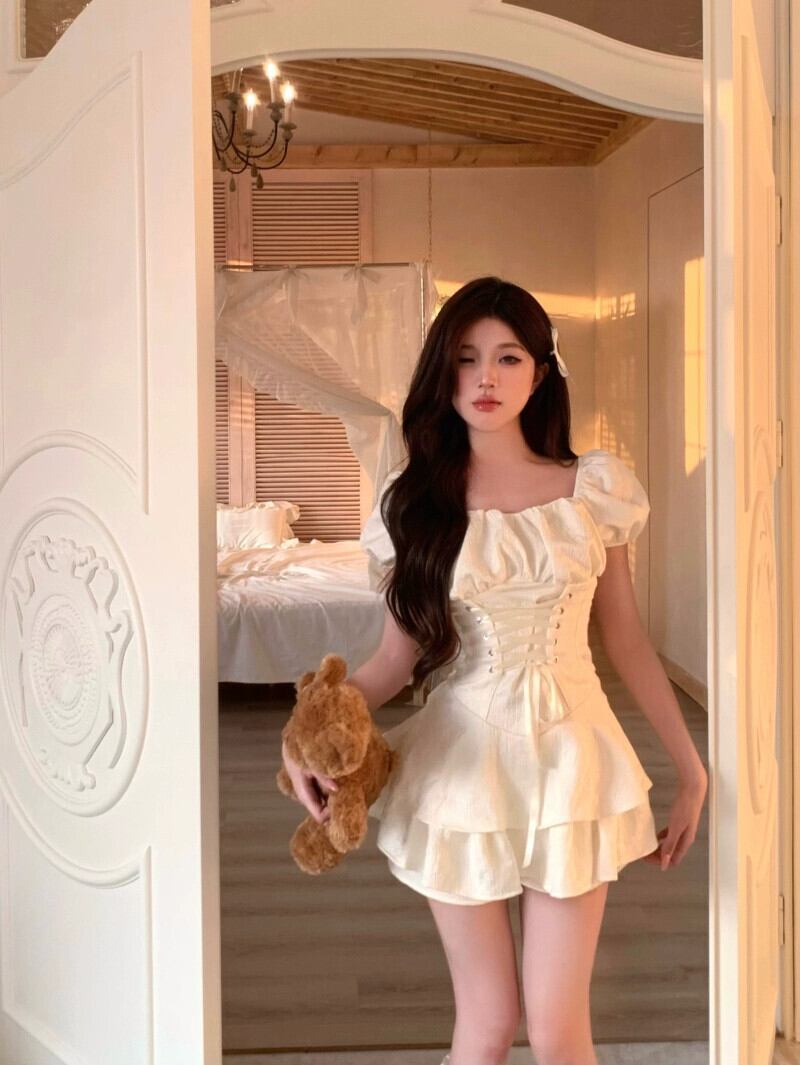 フレンチフィッシュボーンネクタイ半袖ドレス女性の夏の甘いスカートウエスト気質ハイエンドふわふわスカート 大人ガーリー スウィート キュート カジュアル サマー 夏物 bstraw22638257433 | beaute25
