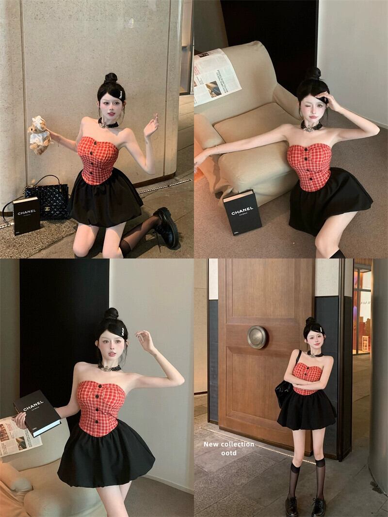 甘いワンショルダーチューブトップドレス女性の夏の純粋な欲望チェック柄ウエストスプライシング小さなふわふわスカート 大人ガーリー スウィート キュート カジュアル サマー 夏物 ピュア bstraw51538601045 | beaute25