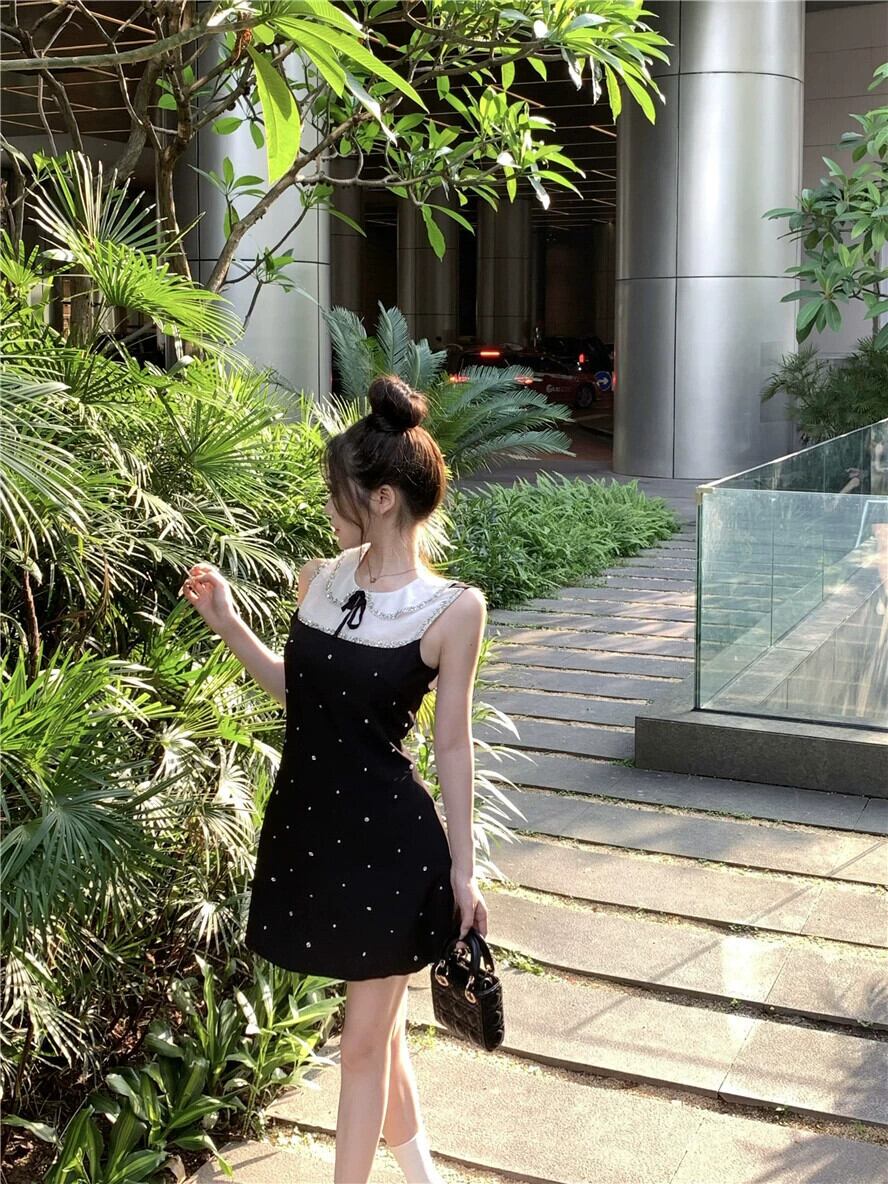 黒重工業ラインストーンドレス女性の夏の人形の襟 A ラインスカートノースリーブウエスト甘い気質スカート ブラック 大人ガーリー スウィート キュート カジュアル サマー 夏物 Aライン bstraw16554811324 | beaute25