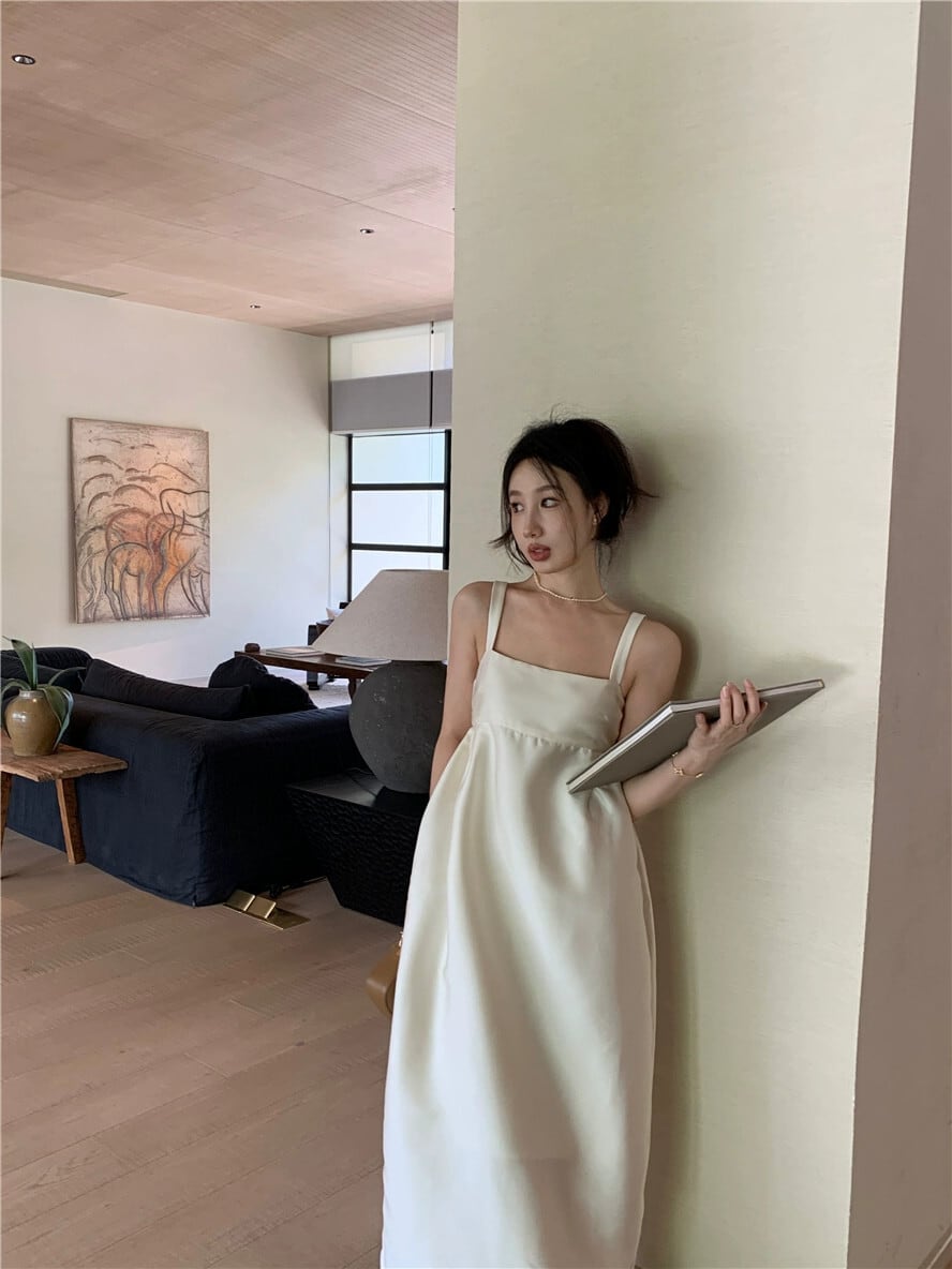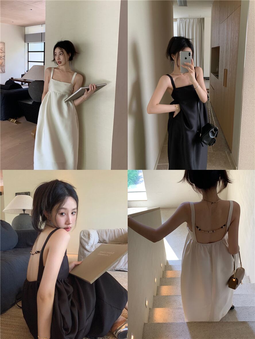 フレンチホワイトワイドショルダーストラップスクエアカラーサスペンダードレス女性の夏のバックレススリットロングスカート気質ハイエンドスカート サマー 夏物 スクウェア bstraw53666546495 | beaute25