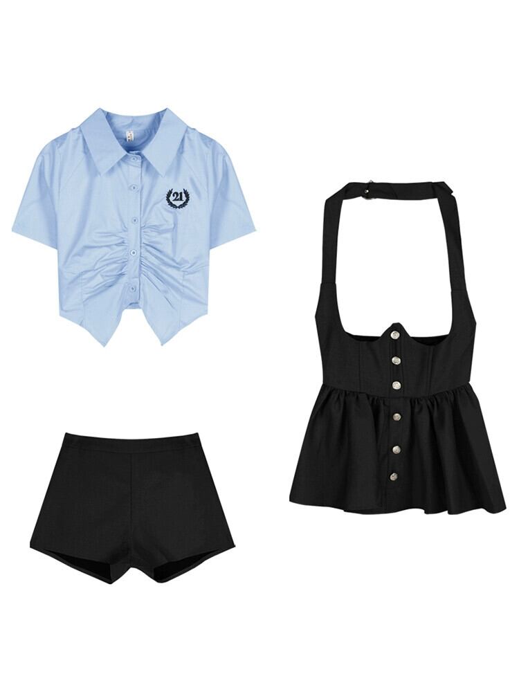 色:青いシャツ,ピンクのシャツ,ブラックストラップドレス,グレーストラップドレス,黒のショートパンツ,グレーのショートパンツ