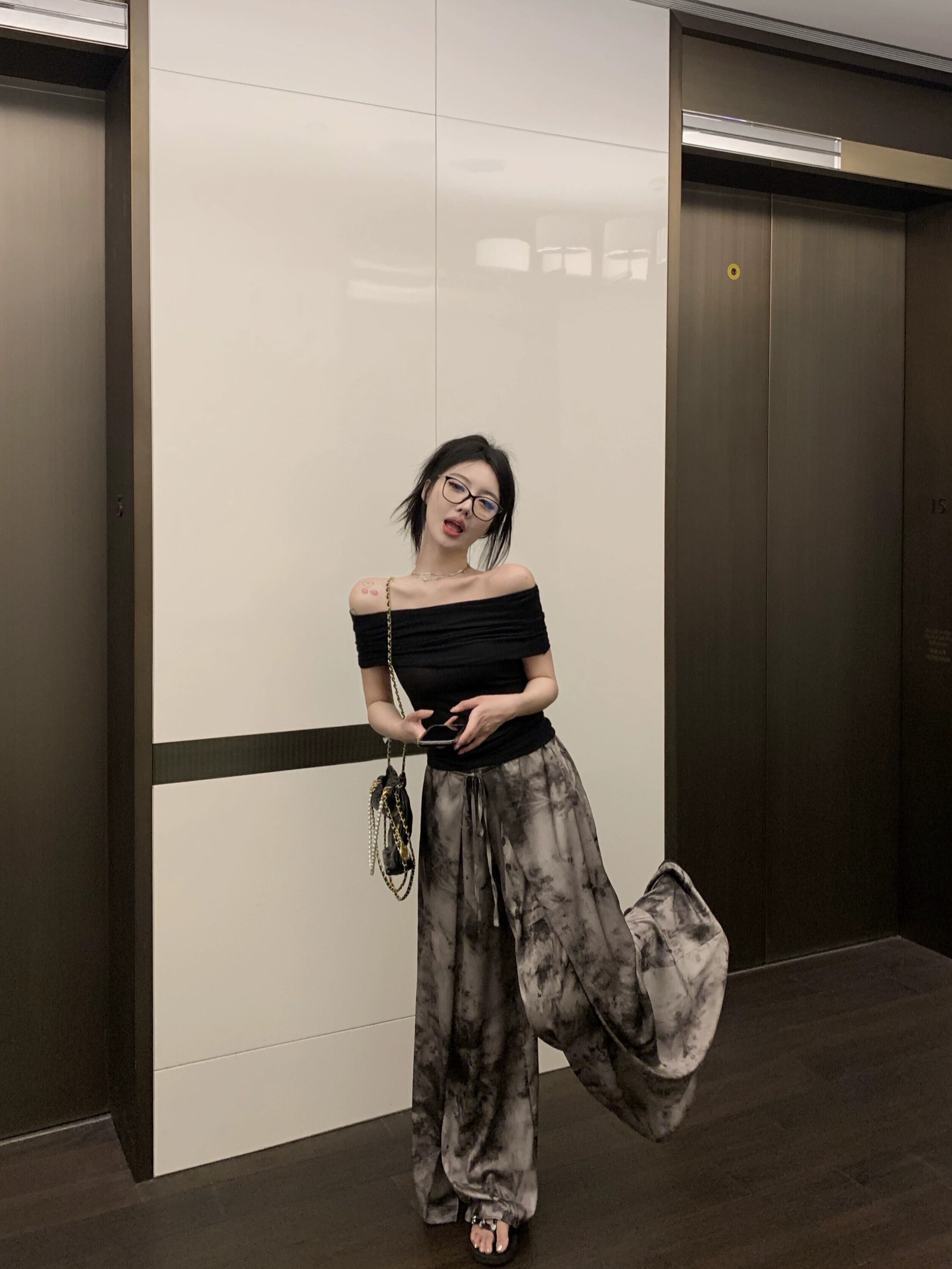 サテンインクプリントワイドレッグパンツ女性の夏のハイウエストルーズドレープストレートレッグパンツストラップカジュアルモップパンツ サマー 夏物 bstraw23266546278 | beaute25
