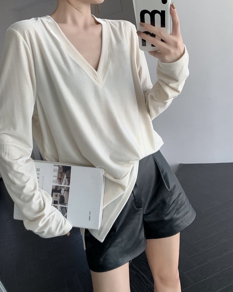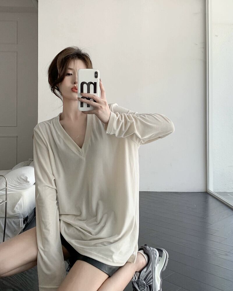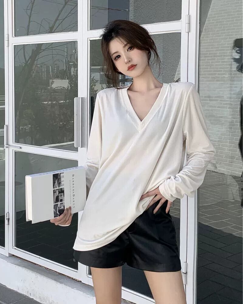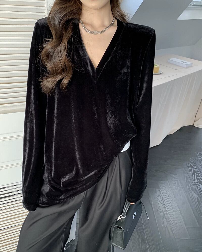 黒の V ネック長袖ベルベット T シャツの女性の秋のハイエンドでエレガントなルーズなミドル丈のインナー レイヤード シャツ トップス ロング レッド ブラック オータム 秋物 Vネック Tシャツ bstraw66998469214 | beaute25