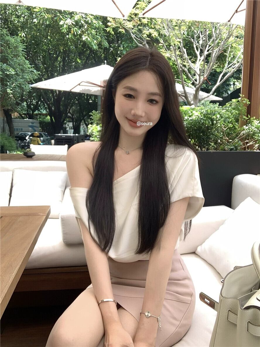 ホワイトハイエンドアセテートサテン半袖 Tシャツ女性の夏の純粋な欲望スタイル 2023 新しい不規則な斜めショルダートップ サマー 夏物 ピュア bstraw87882813373 | beaute25