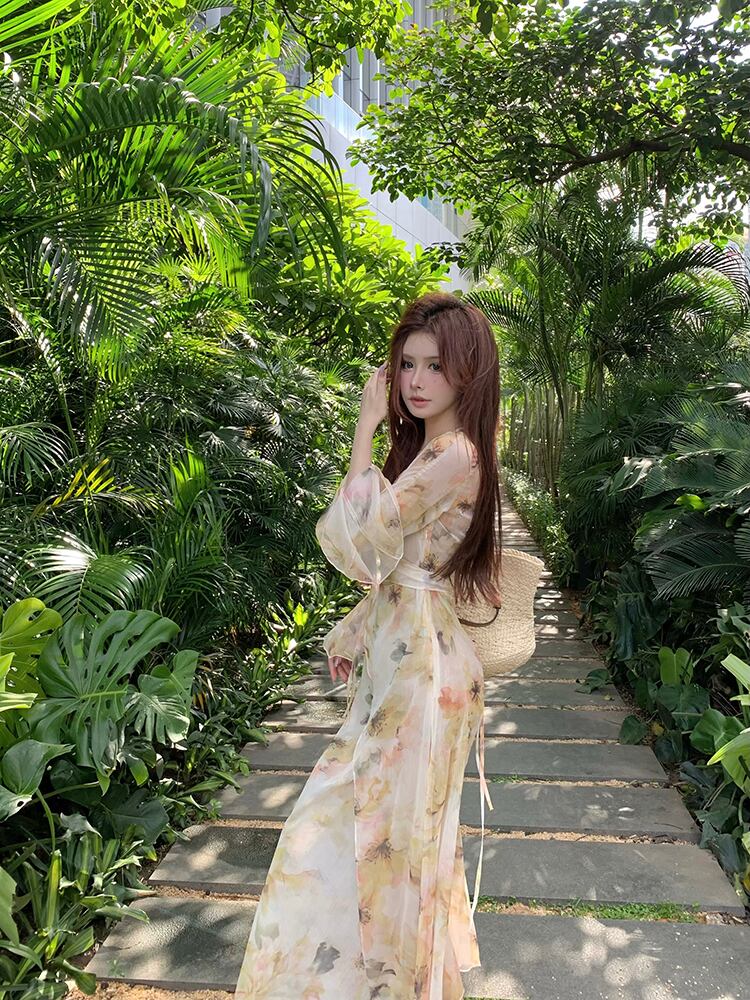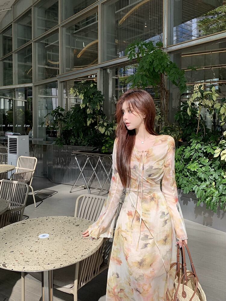 フランスの純粋な欲望優しい花柄 V ネックトランペットスリーブドレスレディース秋シフォン長袖スカートウエストミドルスカート ロング オータム 秋物 Vネック ピュア bstraw62792269379 | beaute25