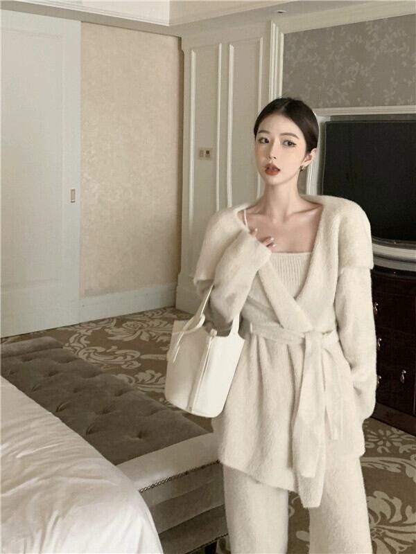色:ベージュのスモールスリング,白いズボン,白いセーター