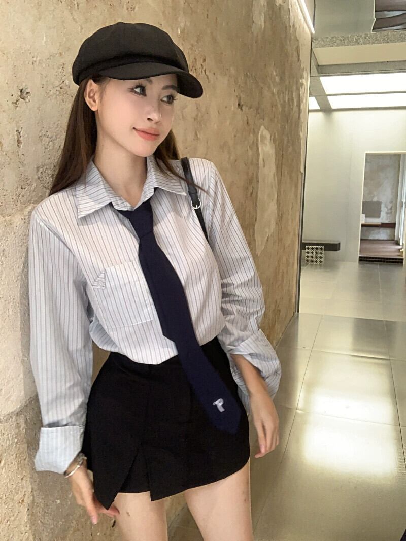 色:ネクタイ付きストライプシャツ,スカートスカート