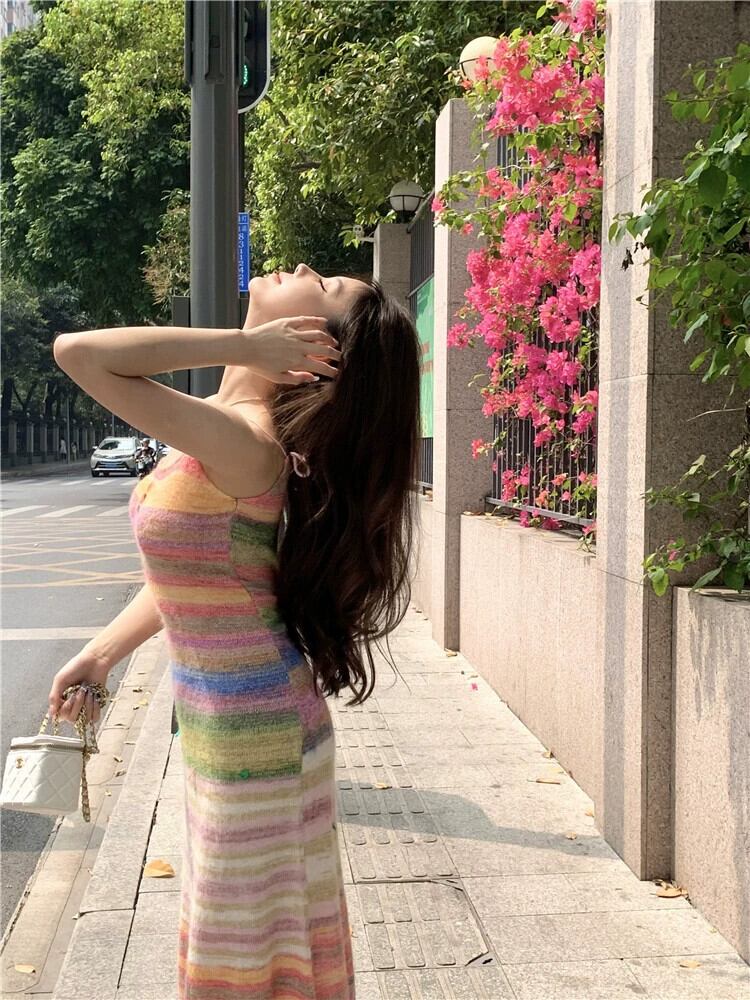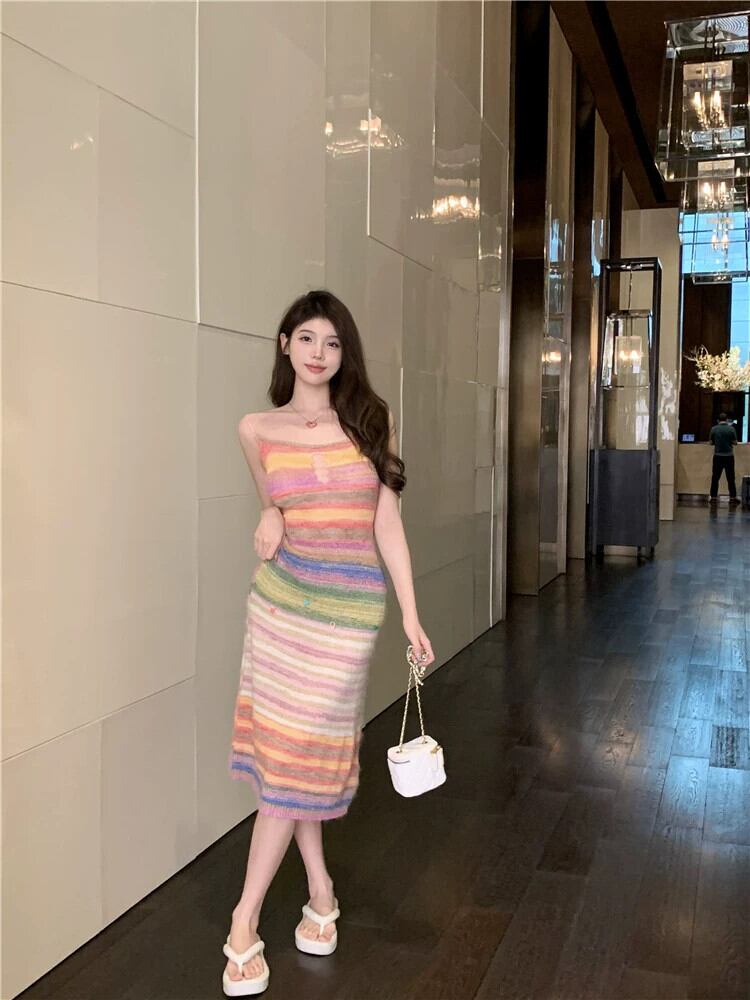甘いレインボーストライプニットサスペンダードレス女性の夏のスカート中空セクシーな気質ウエストロングスカート 大人ガーリー スウィート キュート カジュアル サマー 夏物 bstraw65225317153 | beaute25