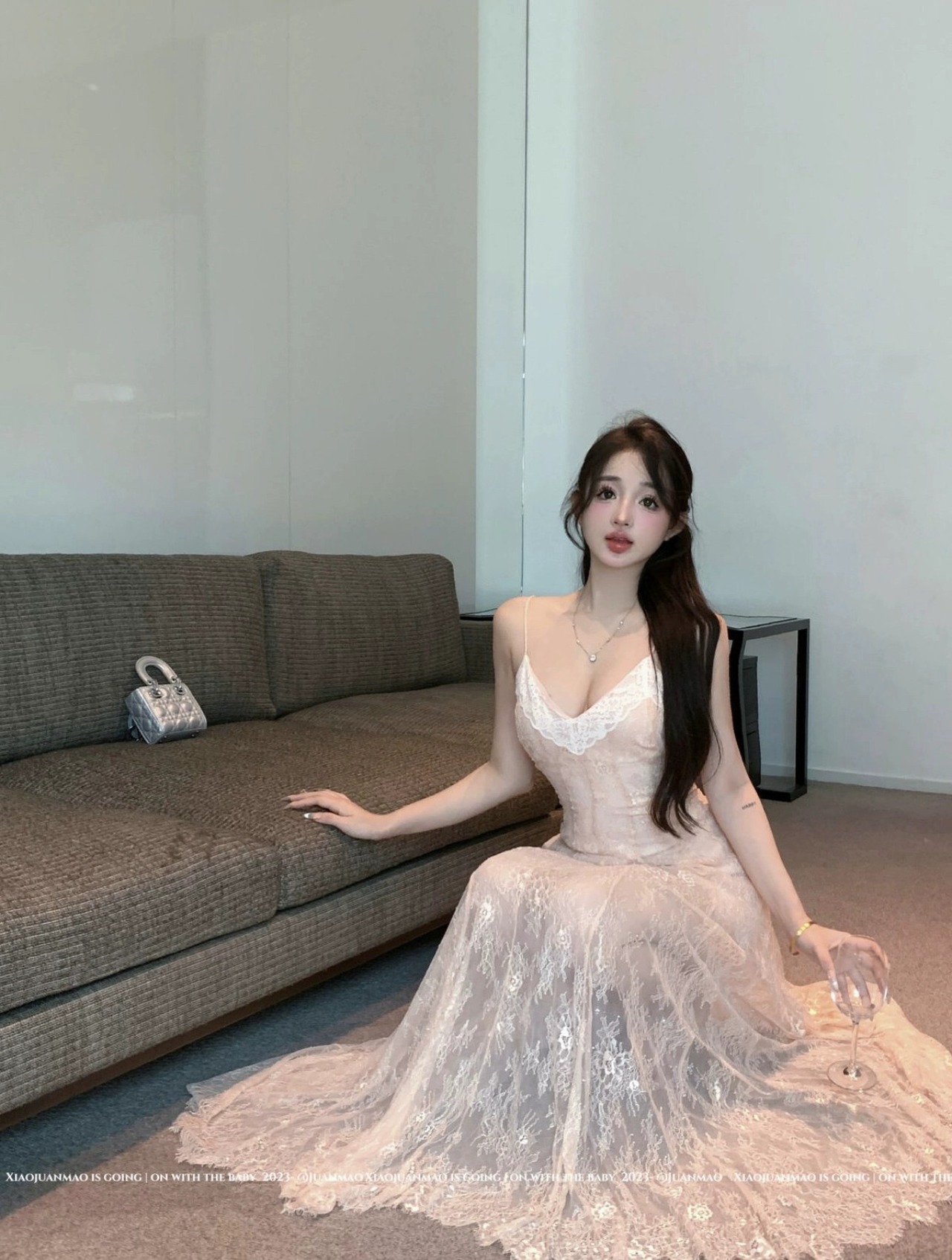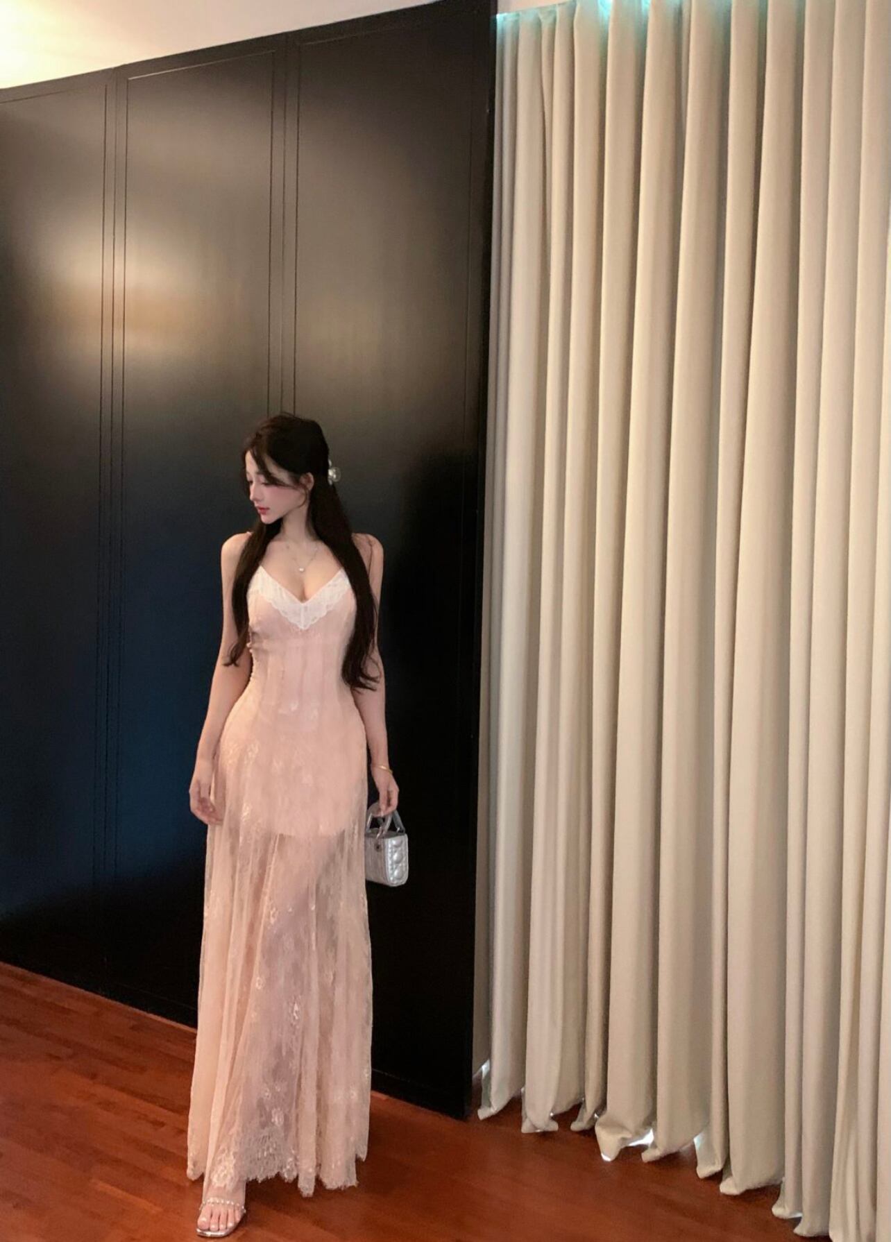 フランス重工業レースサスペンダードレス女性の夏の気質スカートセクシーな V ネックウエスト痩身フロアレングスロングスカート サマー 夏物 Vネック bstraw55792757146 | beaute25