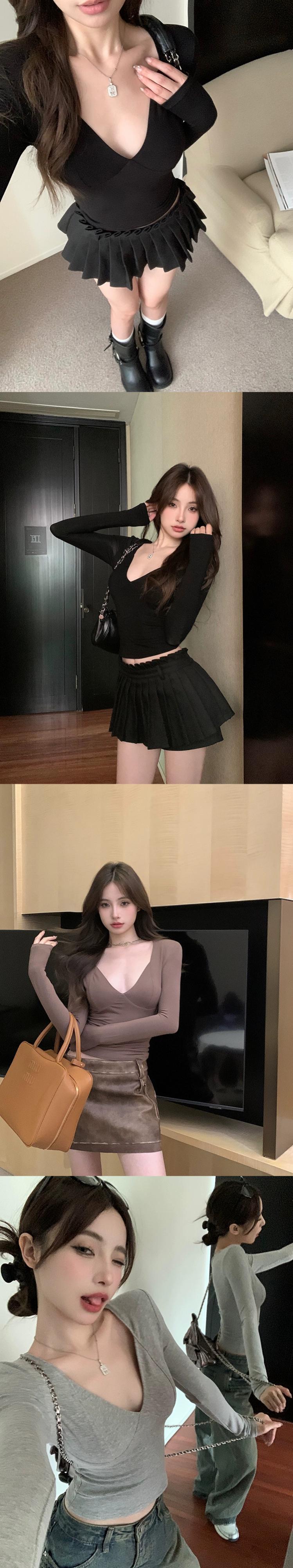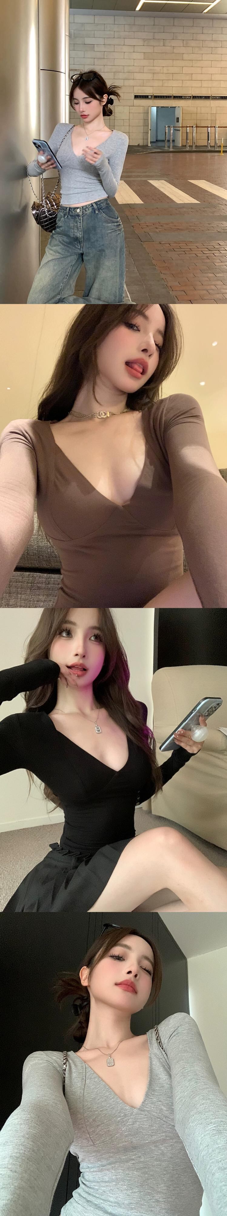 グレー V ネック長袖インナー Tシャツ女性の秋のセクシーなスリムシックなショートボトムシャツモーダルトップ ロング オータム 秋物 Vネック bstraw64880180714 | beaute25