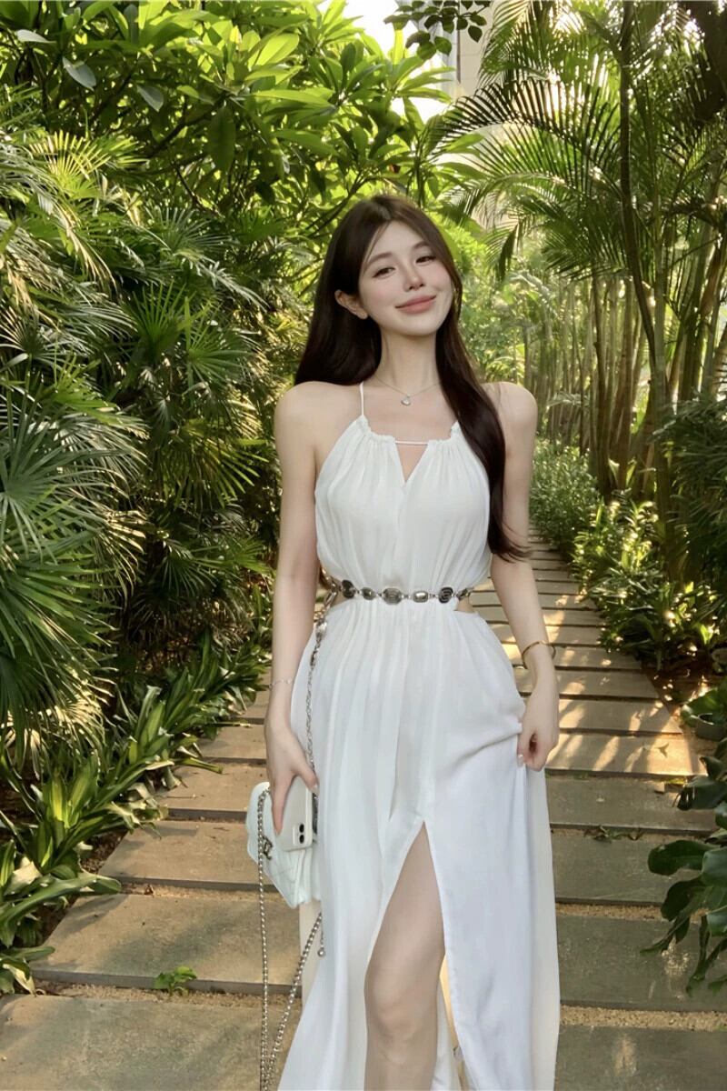 白いノースリーブホルターネックドレス、妖精の夏の海辺のリゾートスタイルのスカート、ウエストを締める気質のスリットAラインロングスカート ホワイト サマー 夏物 bstraw25060783681 | beaute25