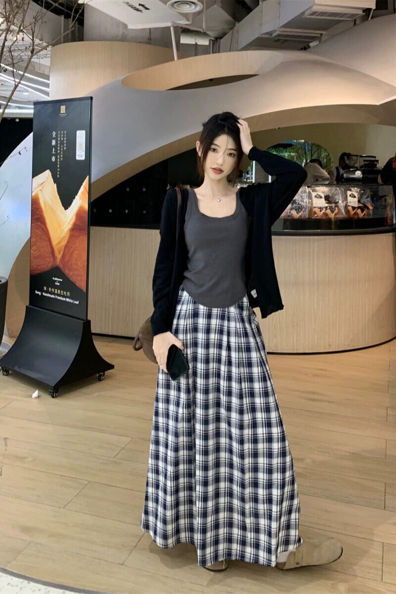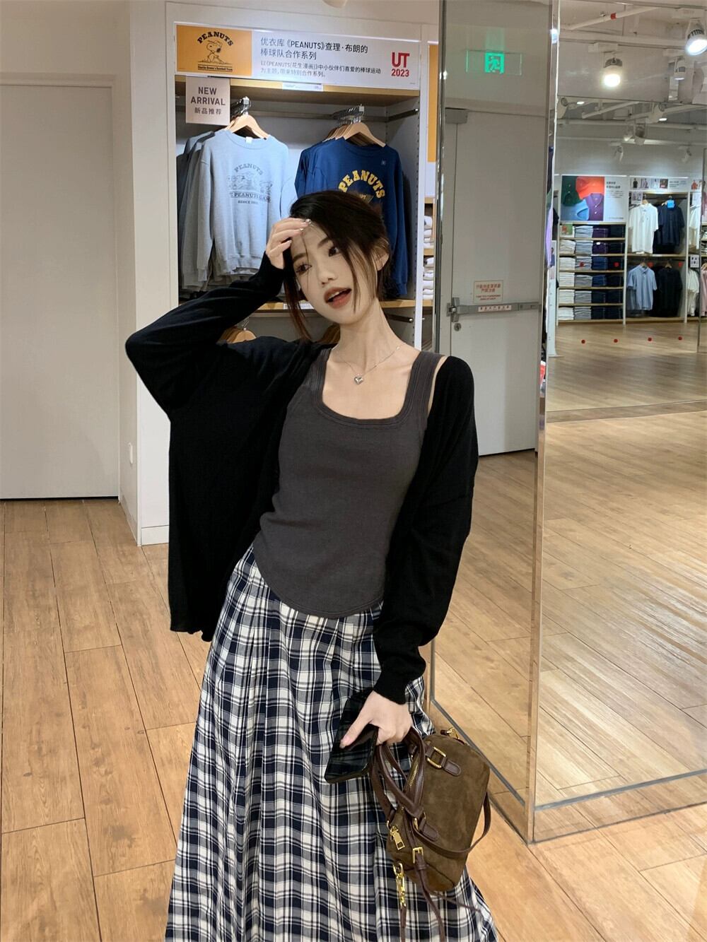 色:グレーのベスト,ブラックカーディガン,チェック柄スカート