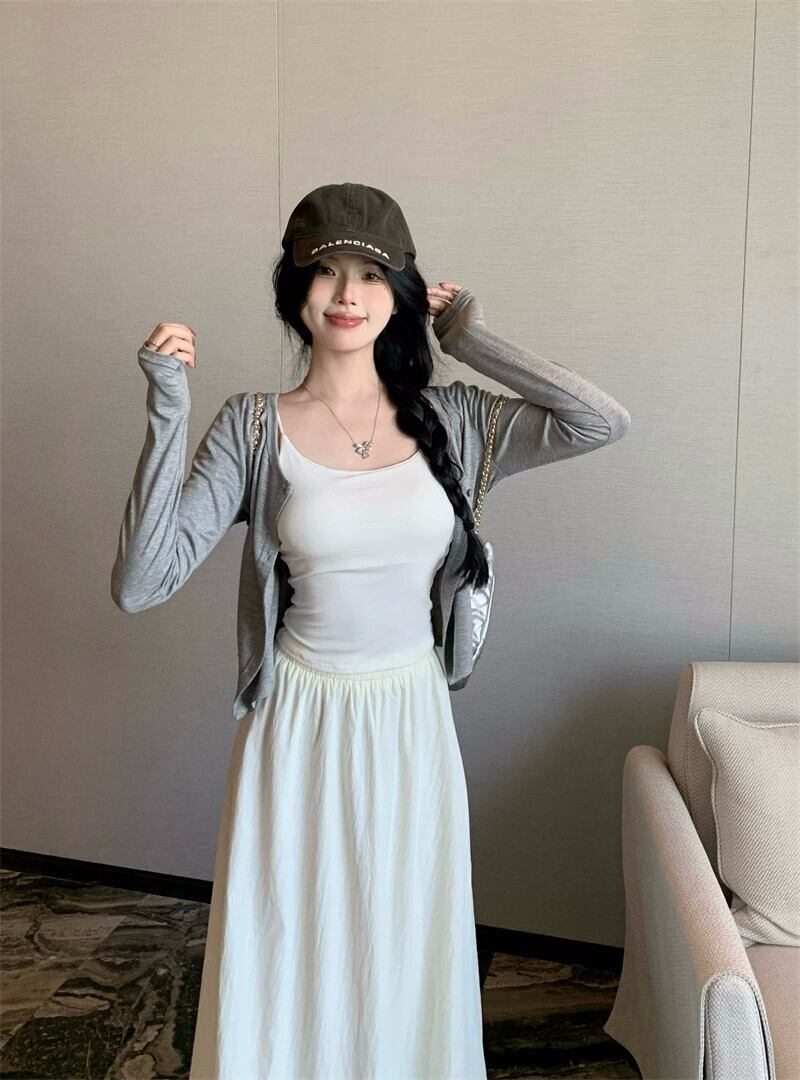 色:グレーのカーディガン,キャミソール,ロングスカート,短いスカート