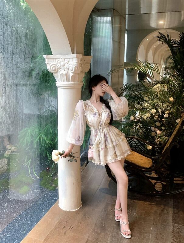 フランスの花柄シフォンドレスレディース、秋デザイン、Vネック長袖レーススカート、ウエストを締めるAラインのふわふわスカート ロング オータム 秋物 bstraw9223508340 | beaute25