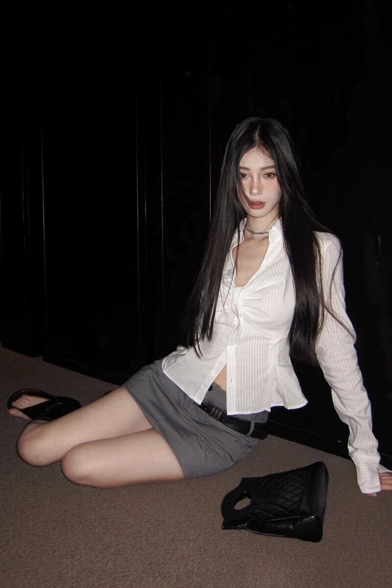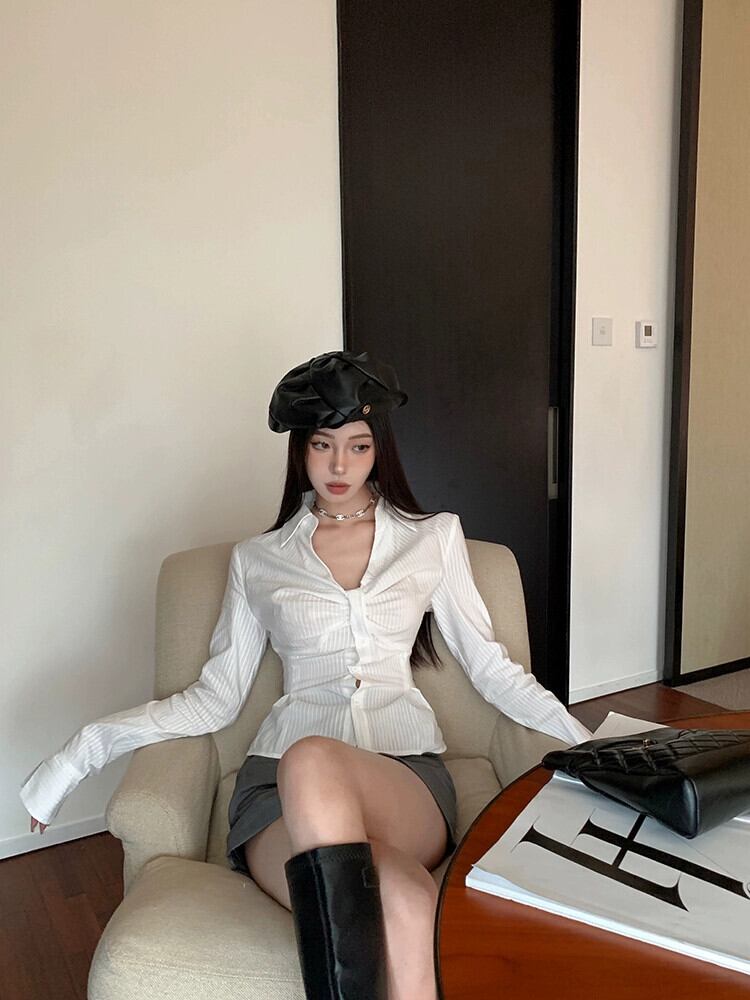 秋の白いストライプの長袖 V ネック シャツの女性のフレンチ スタイルのトップ純粋な欲望スタイルのウエスト スリム シャツ ロング ホワイト オータム 秋物 Vネック ピュア bstraw82103976402 | beaute25