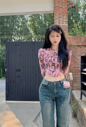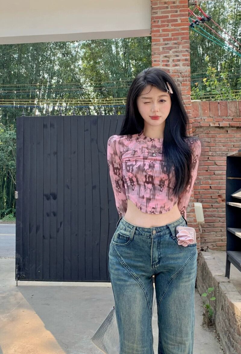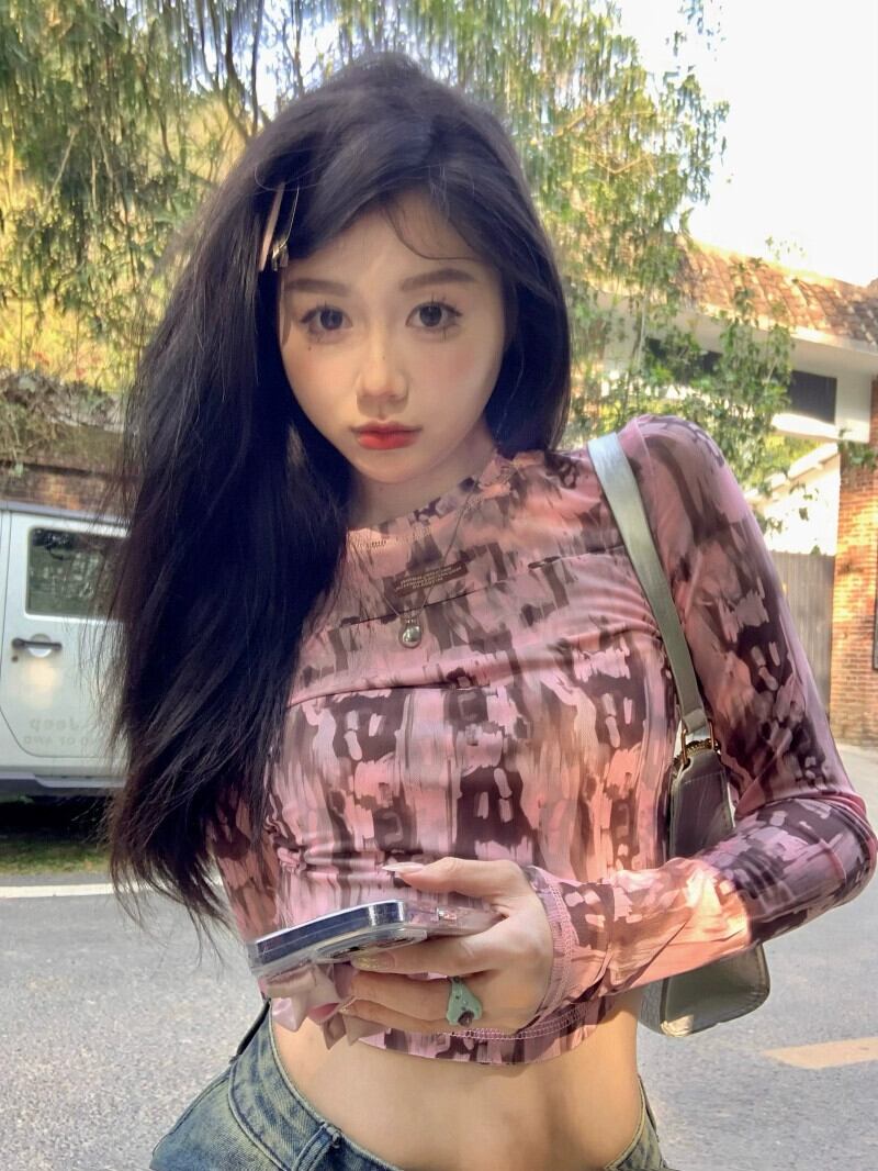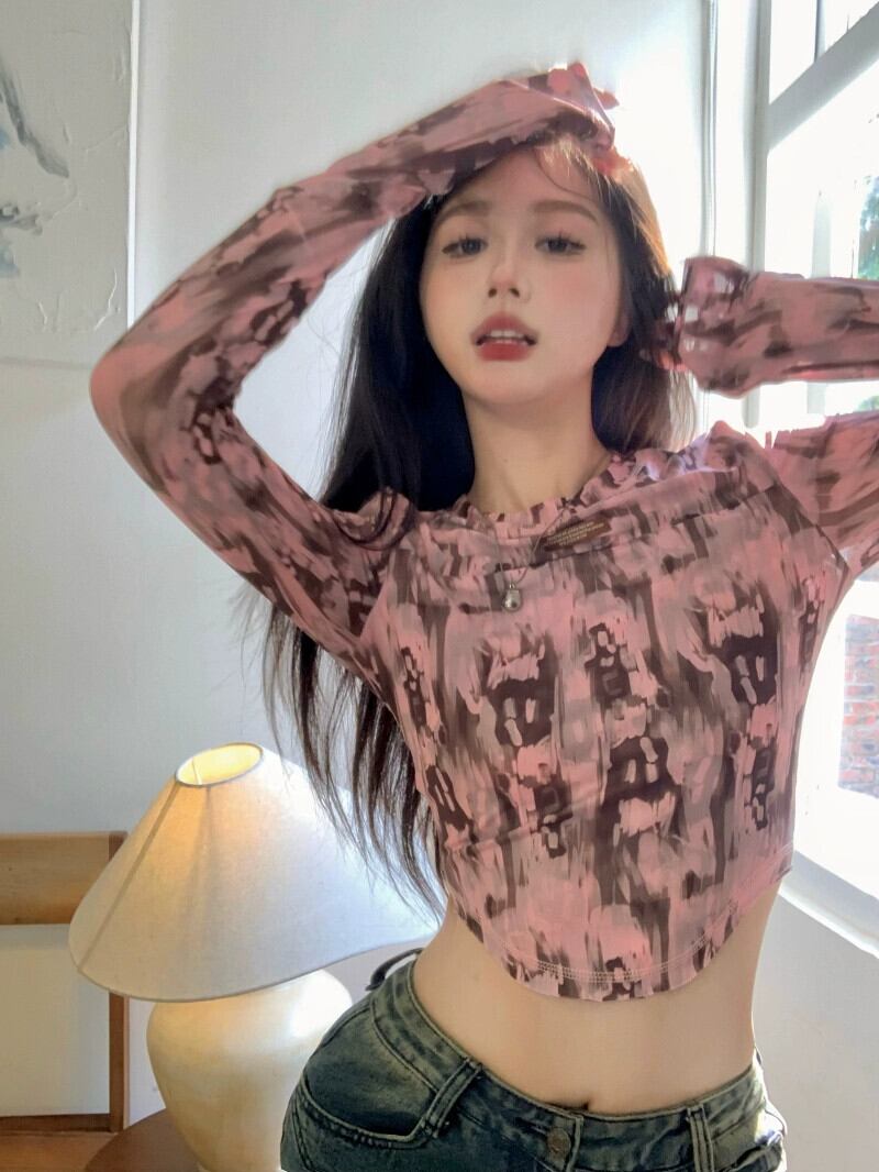 ピンクの絞り染め長袖 T シャツの女性の秋の純粋な欲望スタイルのタイトなシースルーのセクシーな痩身ショート トップ ロング オータム 秋物 Tシャツ ピュア bstraw68735200603 | beaute25