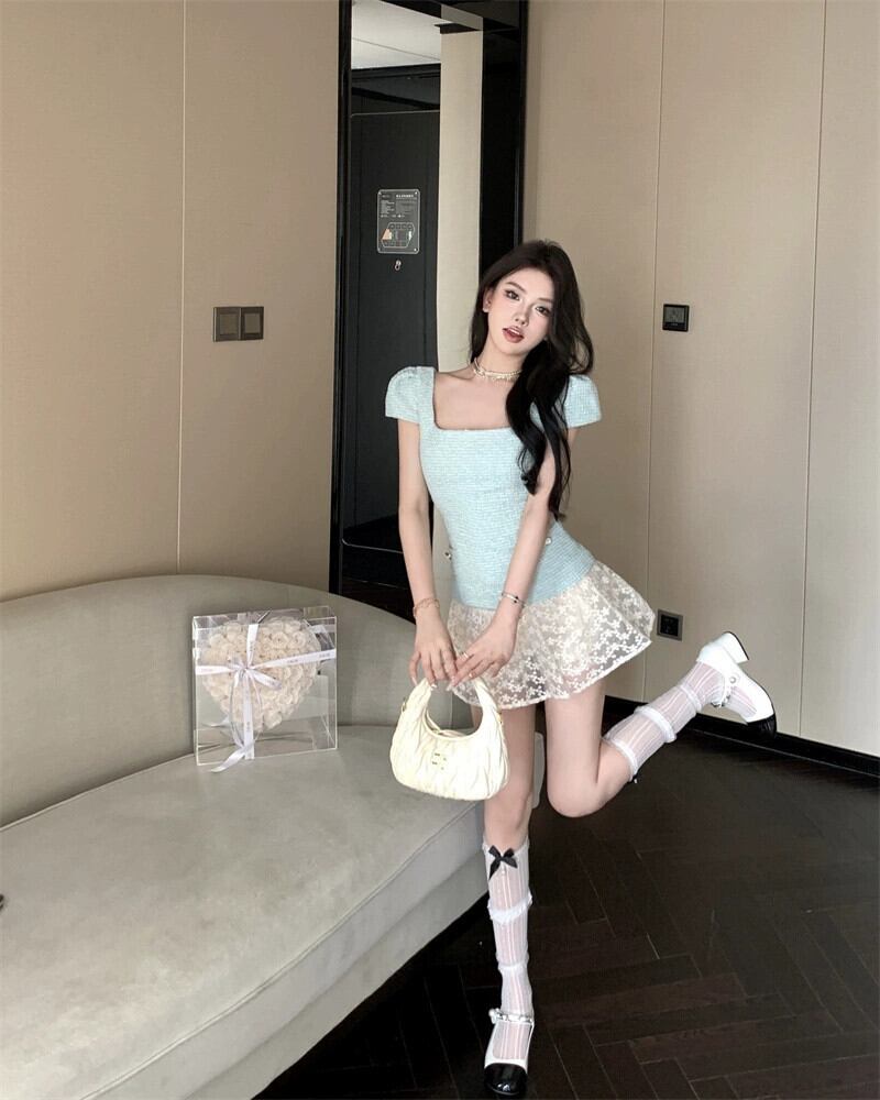 フレンチスタイルのエレガントなスーツ、小さな香りのスタイル、スクエアカラー、パフスリーブトップ、レディースサマーレーススカート、2点セット 夏物 スクウェア bstraw80337005286 | beaute25