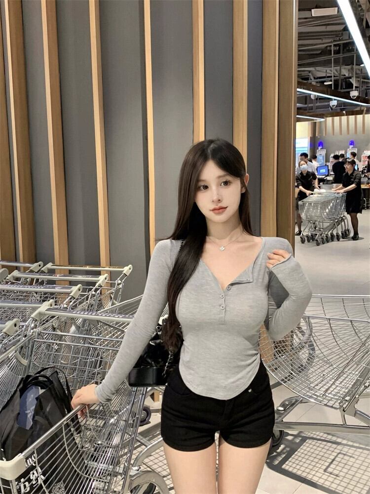 純粋な好色な気質、右肩の長袖 T シャツの女性、秋のスリムフィットのショート ボトム シャツとシックなウエストを締めるアウター トップ ロング オータム 秋物 Tシャツ bstraw10410171850 | beaute25