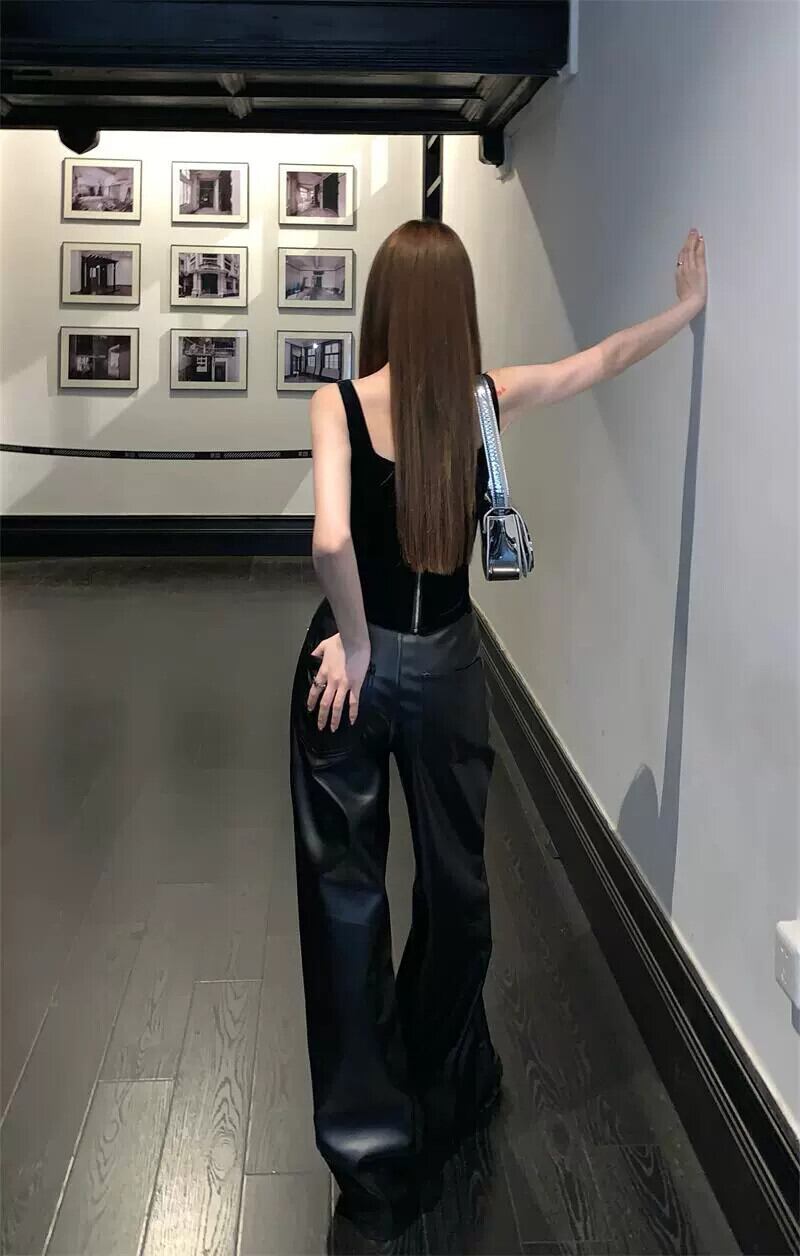 パーソナライズされたファッショントレンディな女性のスーツストレートブラック pu レザーパンツベルベットベストサスペンダーハイウエストスカート 3 点セット ハイウェスト bstraw97668194773 | beaute25