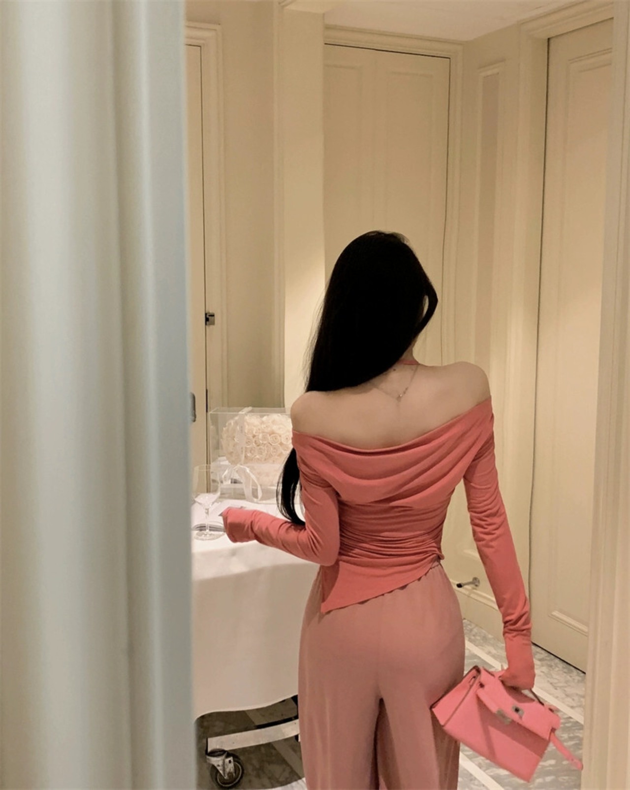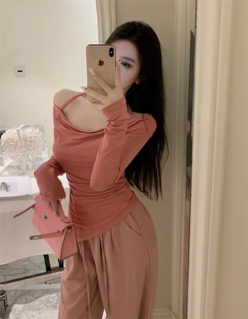 ワンショルダー長袖スイングカラーホルターネック Tシャツ女性の秋の純粋な欲望ピンクのボトムシャツスリムウエスト不規則なトップ ロング オータム 秋物 ピュア bstraw53324089260 | beaute25