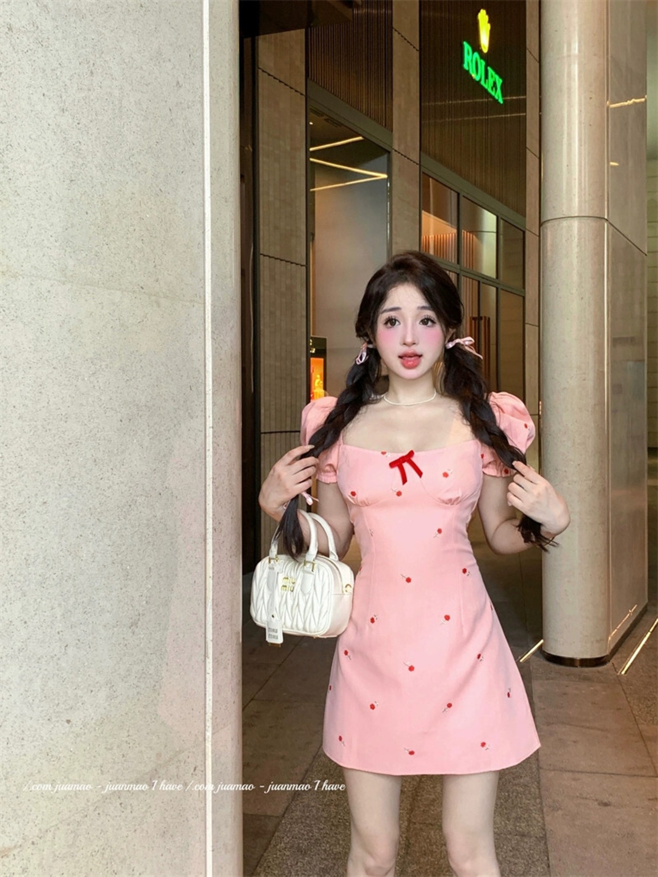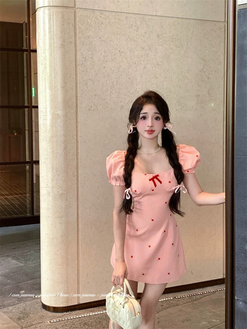 純粋な欲望ホットガールスクエアネックパフ半袖ドレス女性の夏の A ラインスカート気質リボンピンクスカート ショート ハーフスリーブ サマー 夏物 Aライン スクウェア bstraw29742676697 | beaute25