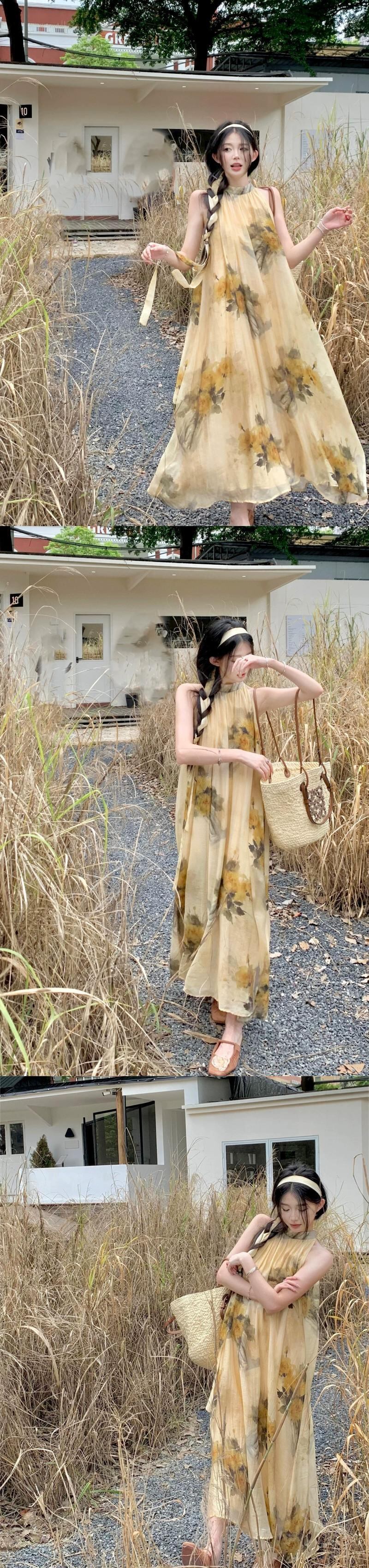 中国風テンセルノースリーブホルターネックドレス女性の夏の海辺のリゾートスタイルのスカート花エレガントな女性のロングスカート サマー 夏物 花柄 bstraw34867148653 | beaute25