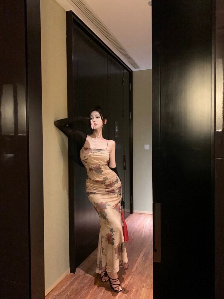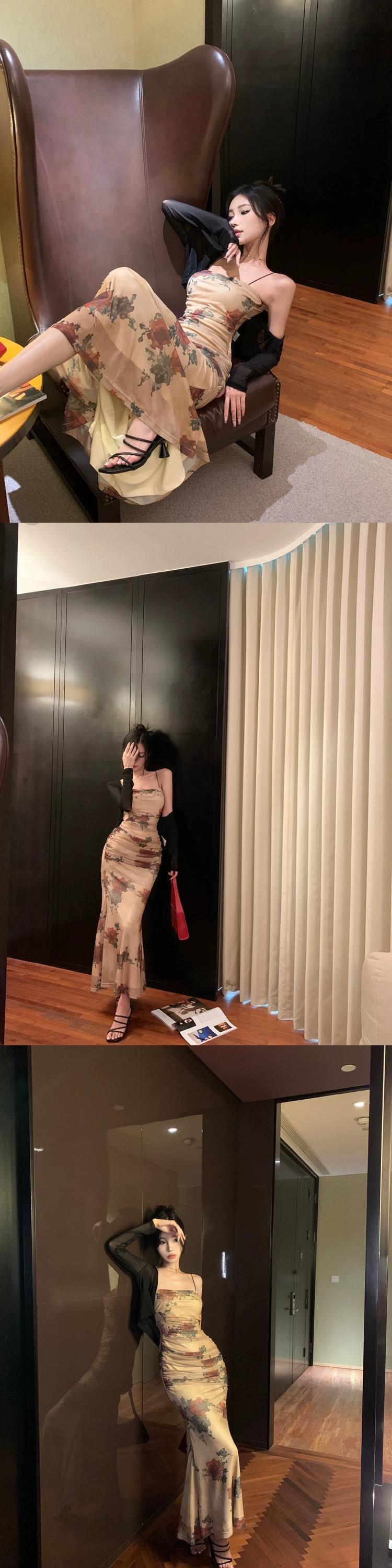 レトロなスタイルのローズ花サスペンダードレス女性の夏のメッシュスカートウエストプリーツヒップハグフィッシュテールロングスカート サマー 夏物 花柄 bstraw47053595519 | beaute25