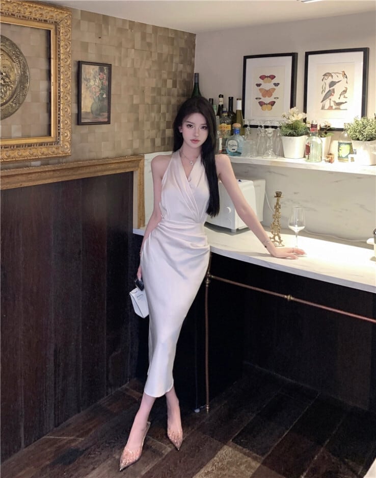 サテン v ネックホルターネックドレス女性の夏の純粋な欲望セクシーなバックレススカートセレブウエストバッグヒップミッドレングススカート サマー 夏物 Vネック ピュア bstraw8311383213 | beaute25