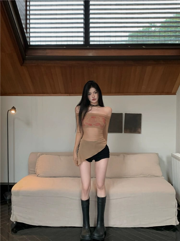 Hot Girl プリント ワンショルダー 長袖 Tシャツ レディース 初秋 鎖骨 日焼け止め メッシュ 不規則なニッチ トップ ロング オータム 秋物 bstraw62525454381 | beaute25